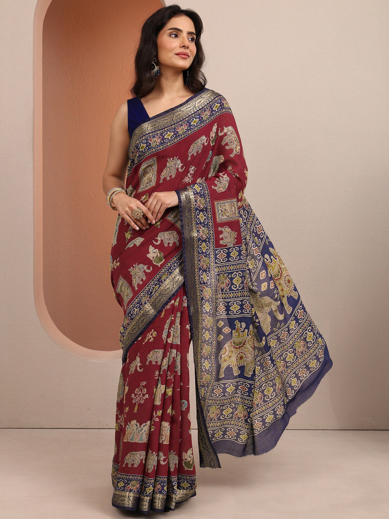 Red Printed Silk Blend Saree With Unstitched Blouse Piece