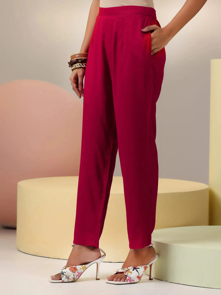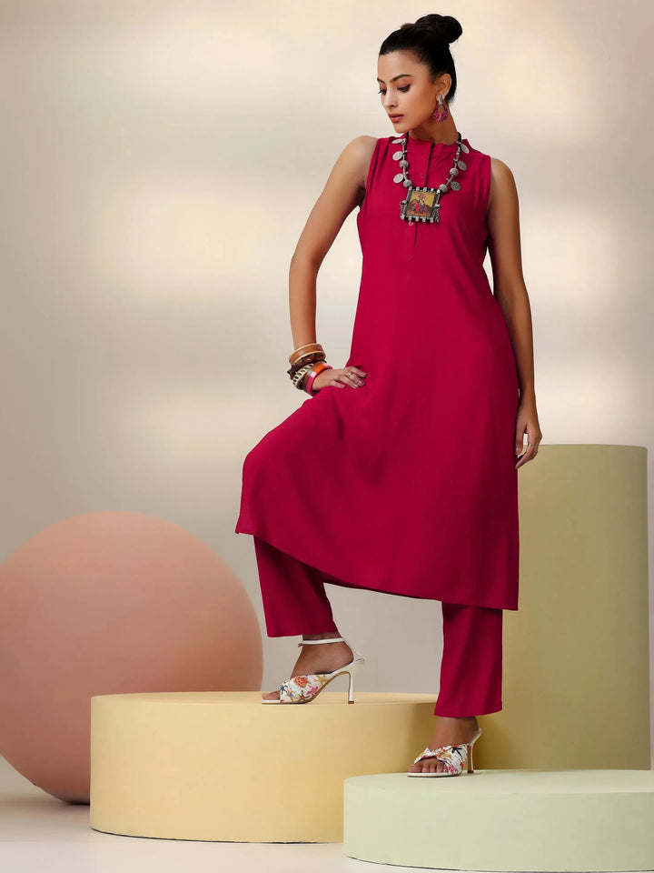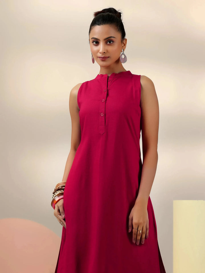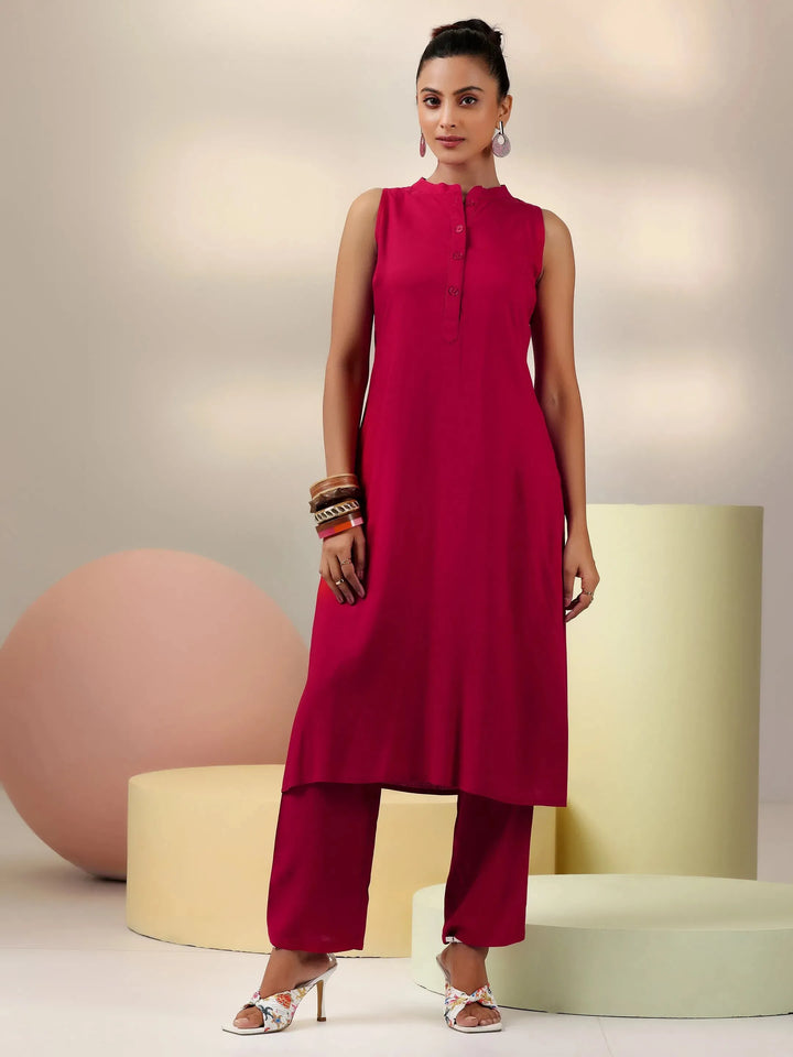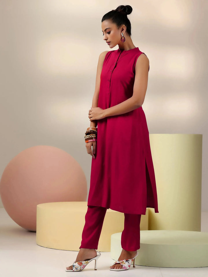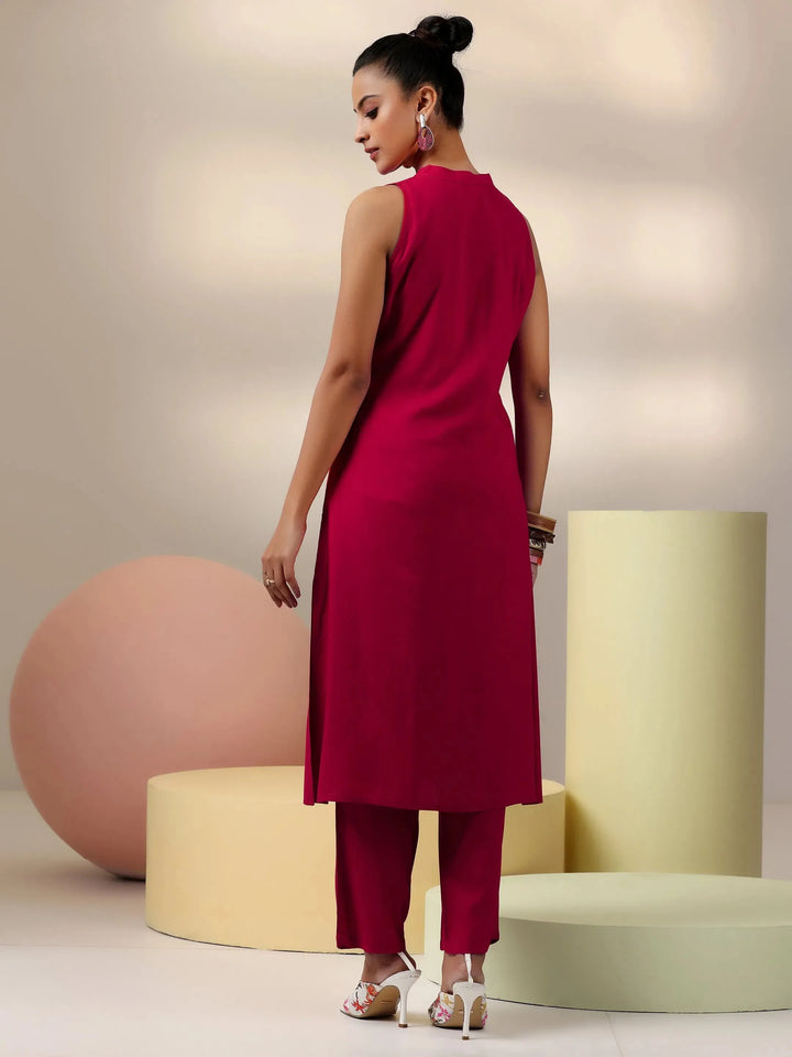 Our 2-piece red solid cotton blend co-ord set features a sleeveless kurta with a mandarin collar. Complemented with matching trousers with a partially elasticated waistband and roomy pockets. Highlighted with stylish button accents, this style is perfect for casual outings.