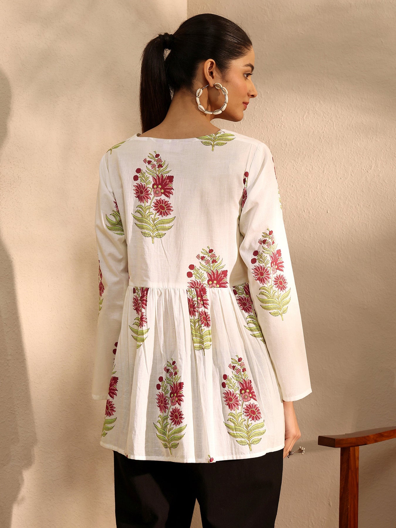 Our 1-piece off white cotton A-line kurta features a V-neckline, regular sleeves, and statement Yoke. Adorned with floral print, this style is perfect for work wear and casual wear.