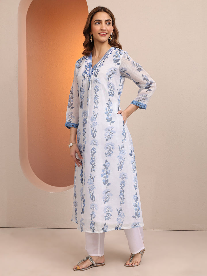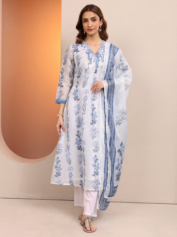 Our 3-piece white and blue Kota straight-fit kurta set features a V-neckline, regular sleeves, and a statement yoke. Complemented with straight pants with a partially elasticated waistband and a printed dupatta. Adorned with floral motif printed, this style is perfect for Work Wear and Casual Wear.