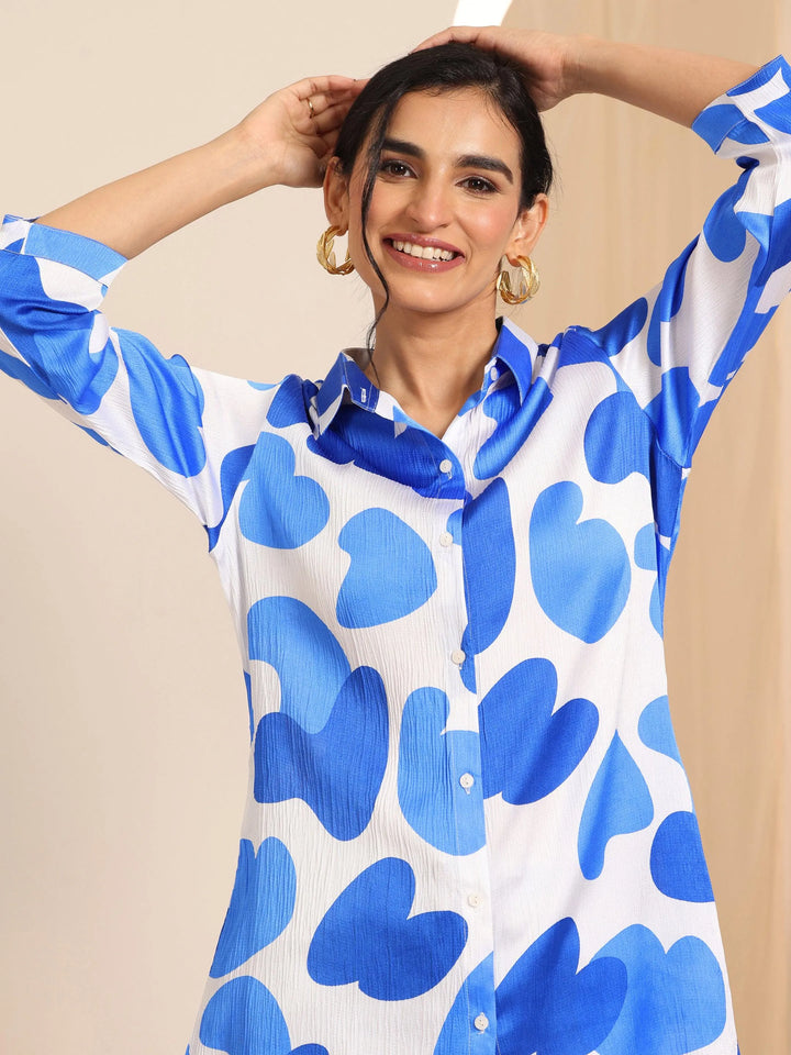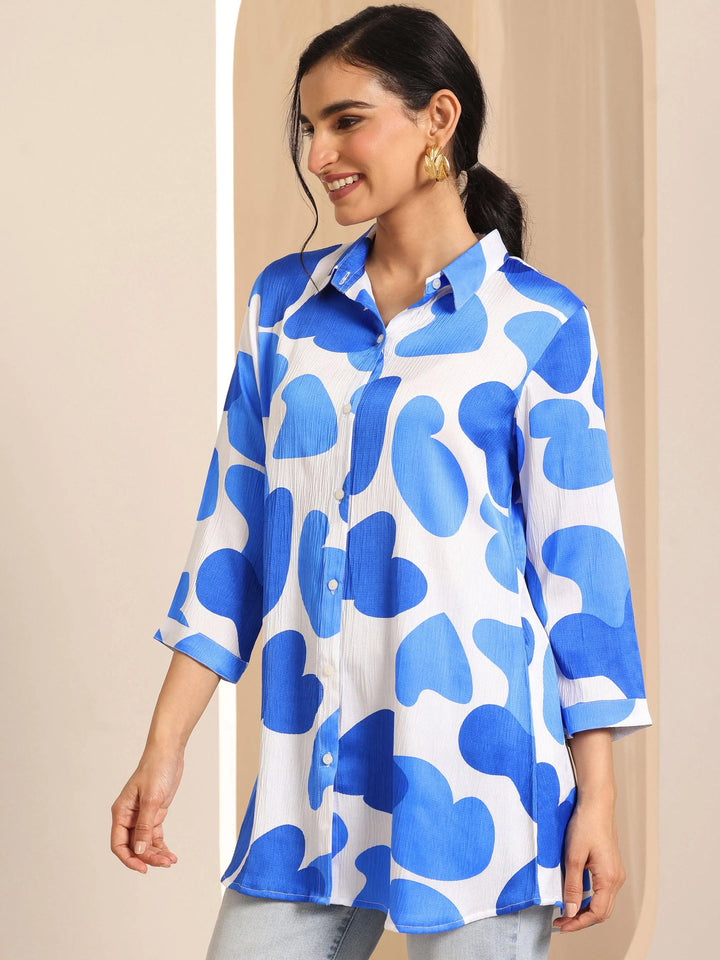 Our blue and white printed silk blend kurti features a shPairt collar neckline and three-quarter sleeves. Highlighted with captivating printed embellishments, this style is perfect for casual wear.