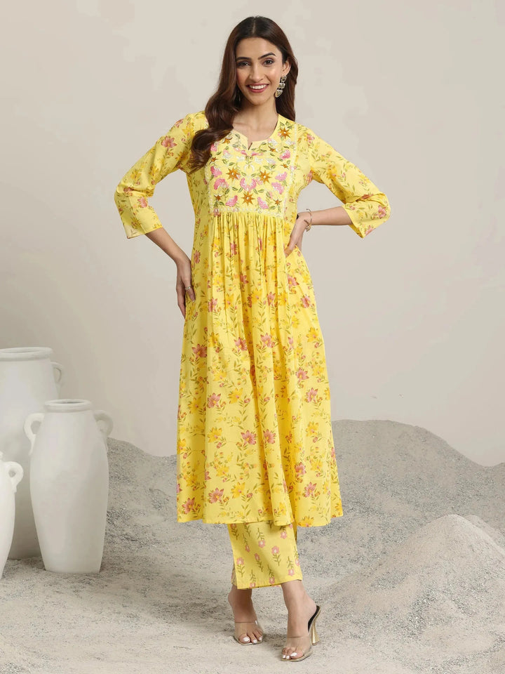 Our 2-piece yellow printed A-line kurta set features a flared kurta with a notched neckline, three-quarter sleeves, and a statement yoke. Complemented with trousers with a partially elasticated waistband and roomy pockets. Highlighted with floral embroidery, this style is perfect for casual outings.