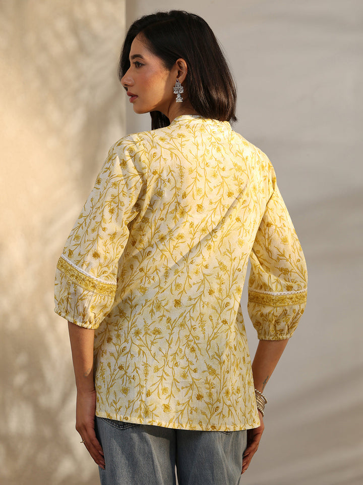 Our 1-piece yellow off-white cotton fit and flare features a mandarin collar neckline, regular sleeves, and statement yoke. Adorned with floral print, this style is perfect for work wear and casual wear.