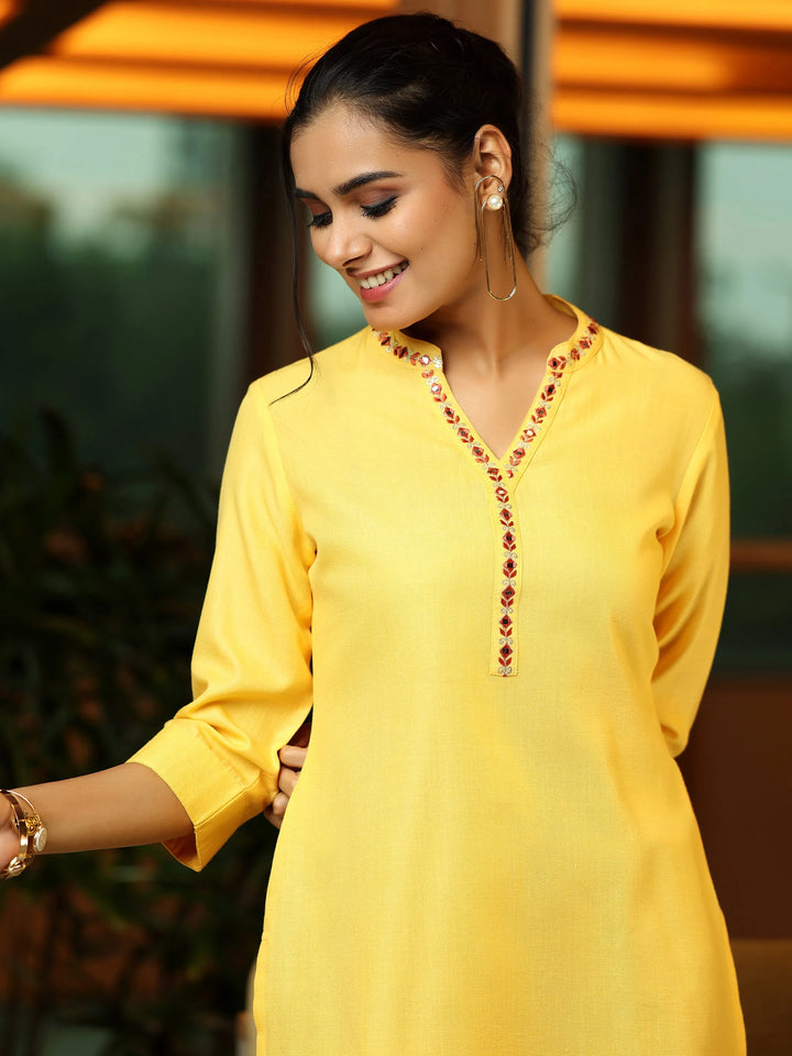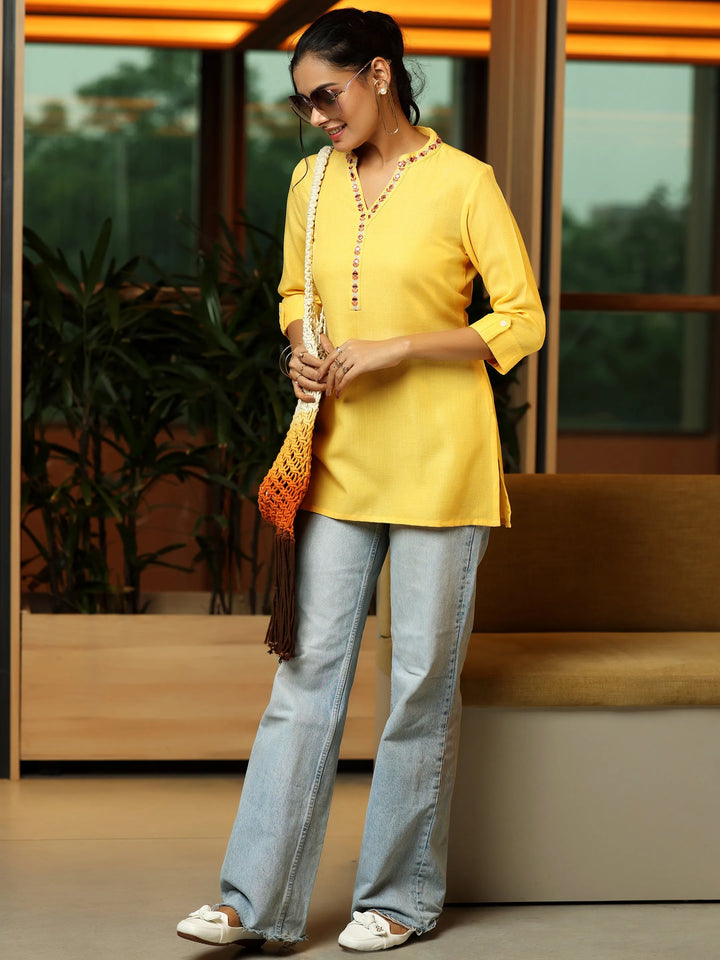Our yellow solid cotton blend straight kurti features a mandarin notched neckline and three-quarter sleeves. Highlighted with mirror accents, this style is perfect for casual outings.