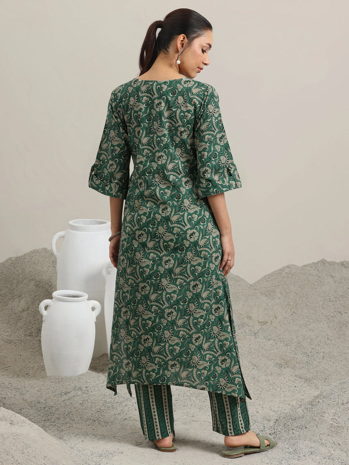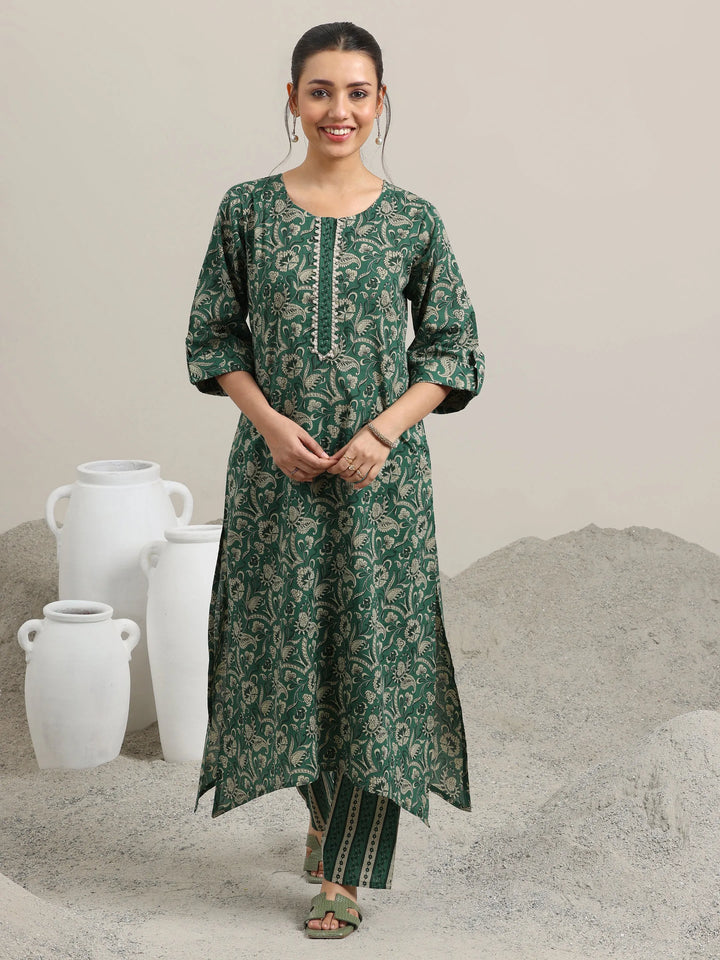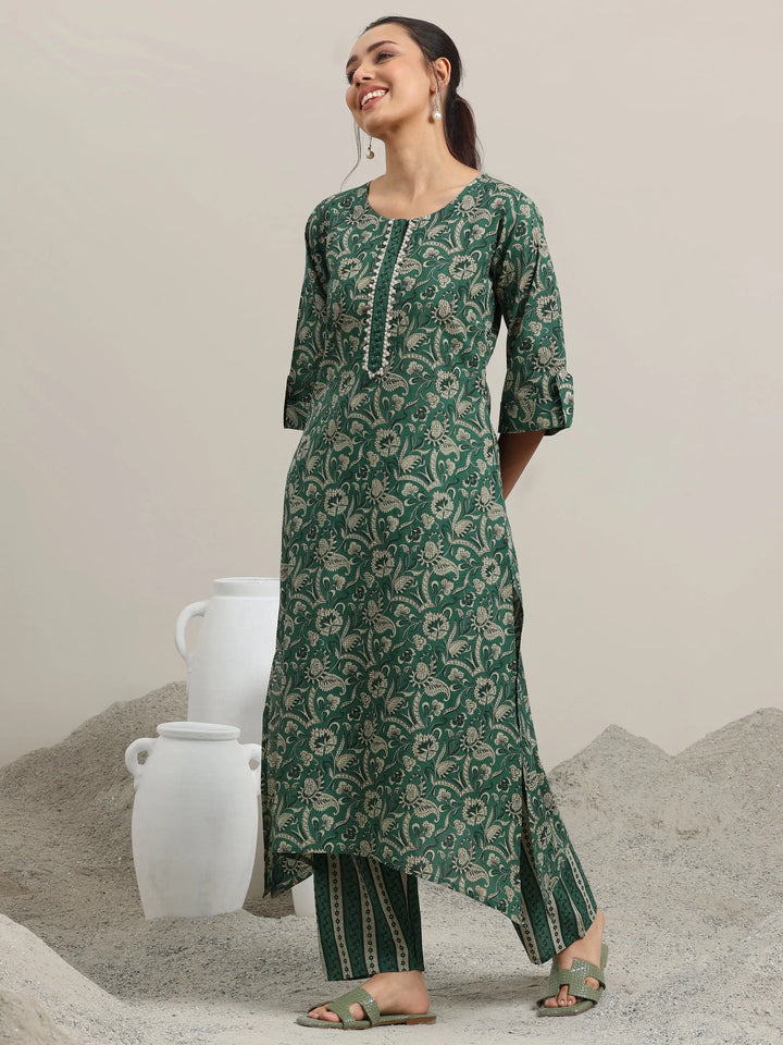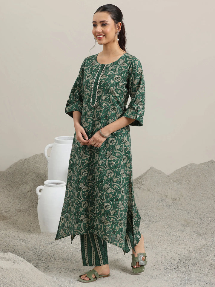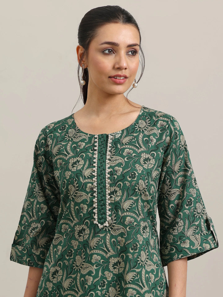 Our 2-piece mauve printed cotton straight kurta set features a kurta with a round neckline, three-quarter roll-up sleeves, and curved hemline. Complemented with palazzo pants with a partially elasticated waistband and roomy pockets. Highlighted with beaded accents and floral prints, this style is perfect for casual outings.