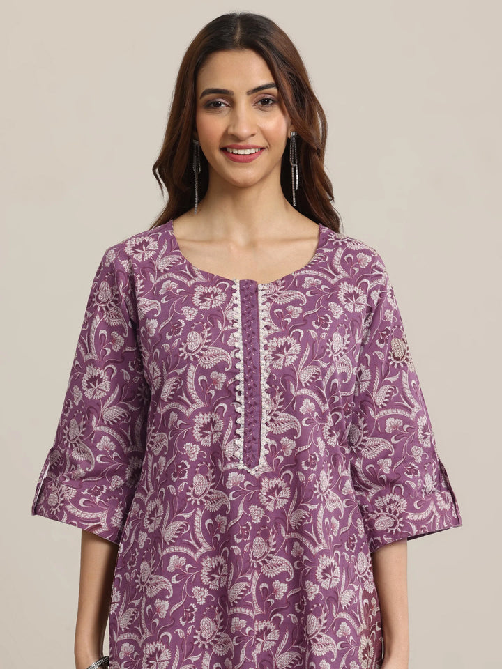 Our 2-piece mauve printed cotton straight kurta set features a kurta with a round neckline, three-quarter roll-up sleeves, and curved hemline. Complemented with palazzo pants with a partially elasticated waistband and roomy pockets. Highlighted with beaded accents and floral prints, this style is perfect for casual outings.