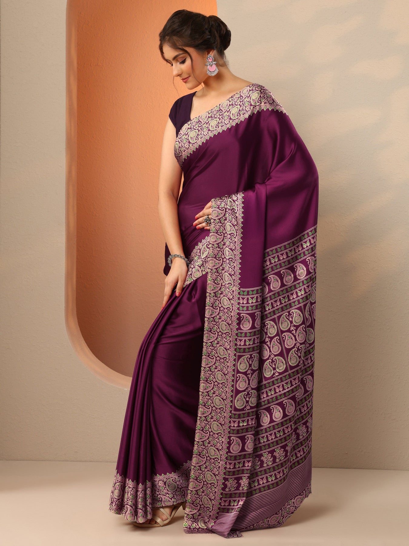 Our Purple Printed Satin Saree Features Captivating Paisley Print. Complemented With An Unstitched Blouse Piece. This Charming Saree Is Perfect For Dark Festive Wear