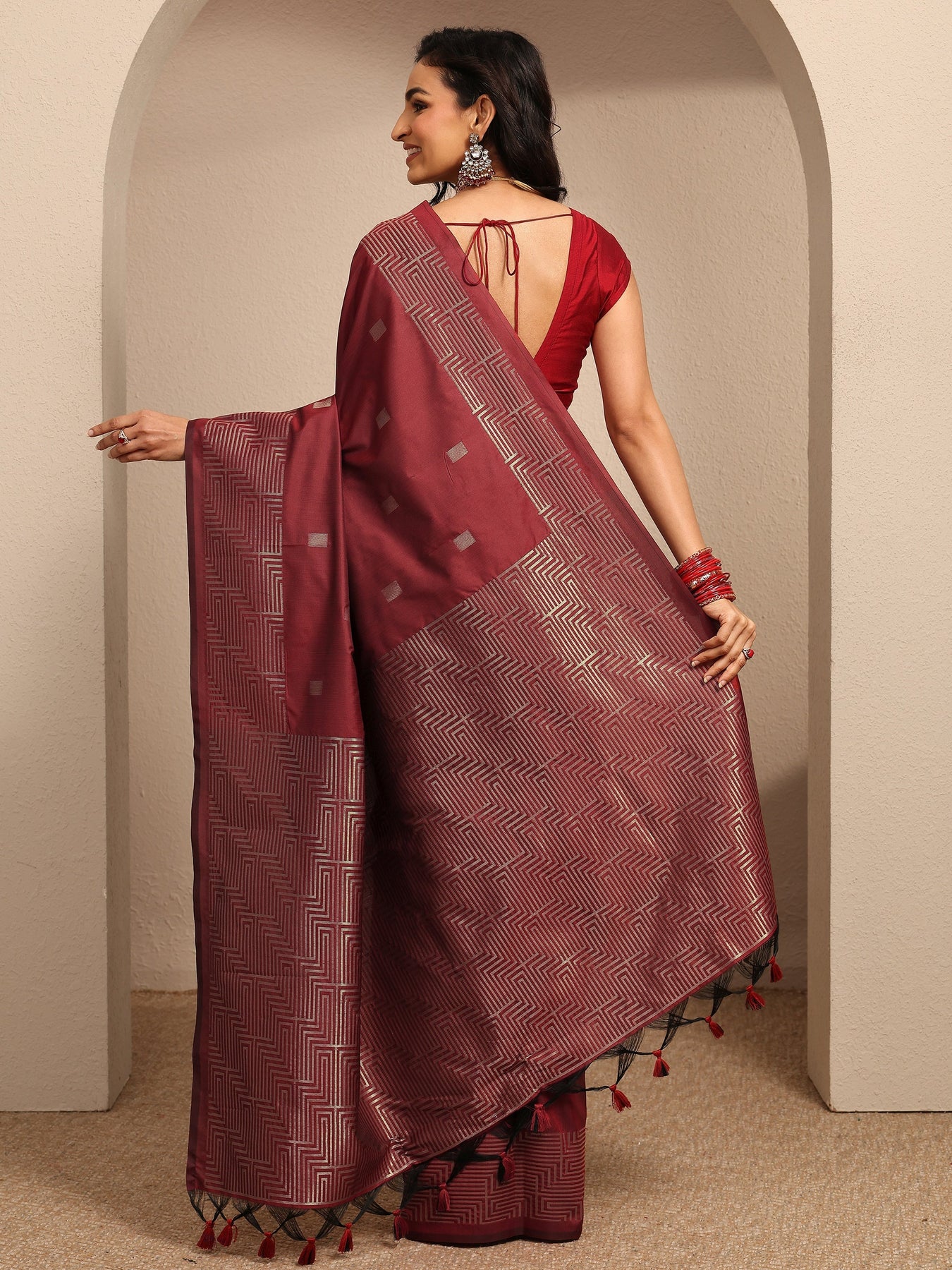 Our maroon printed silk blend saree features captivating geometric print. Complemented with a Unstitched blouse. This charming saree is perfect for festive occasions.