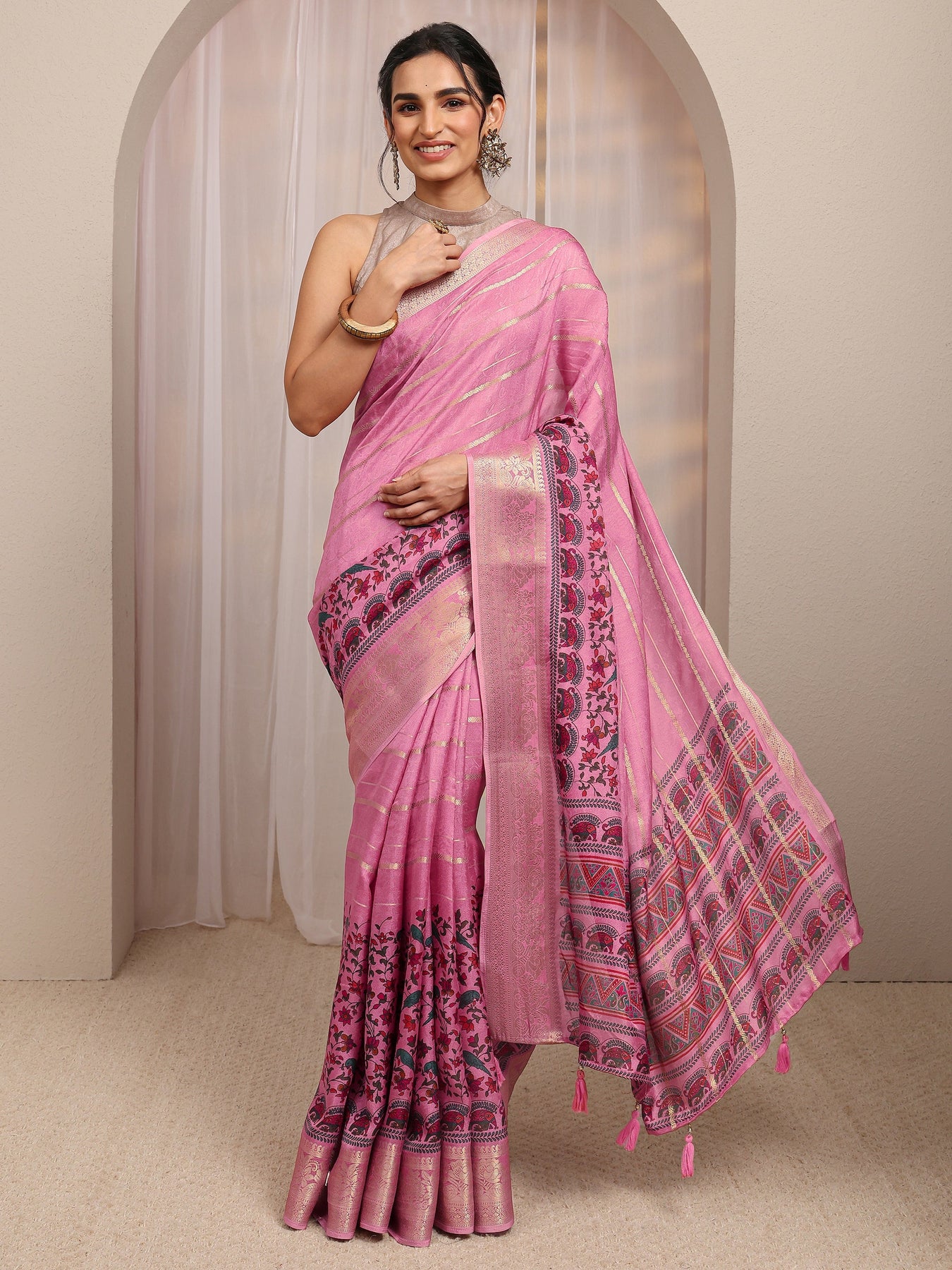 Our pink silk blend saree features a captivating woven design inspired by the rich craft of Baluchari weaves. Complemented with a Unstitched blouse piece. This charming saree is perfect for festive occasions.