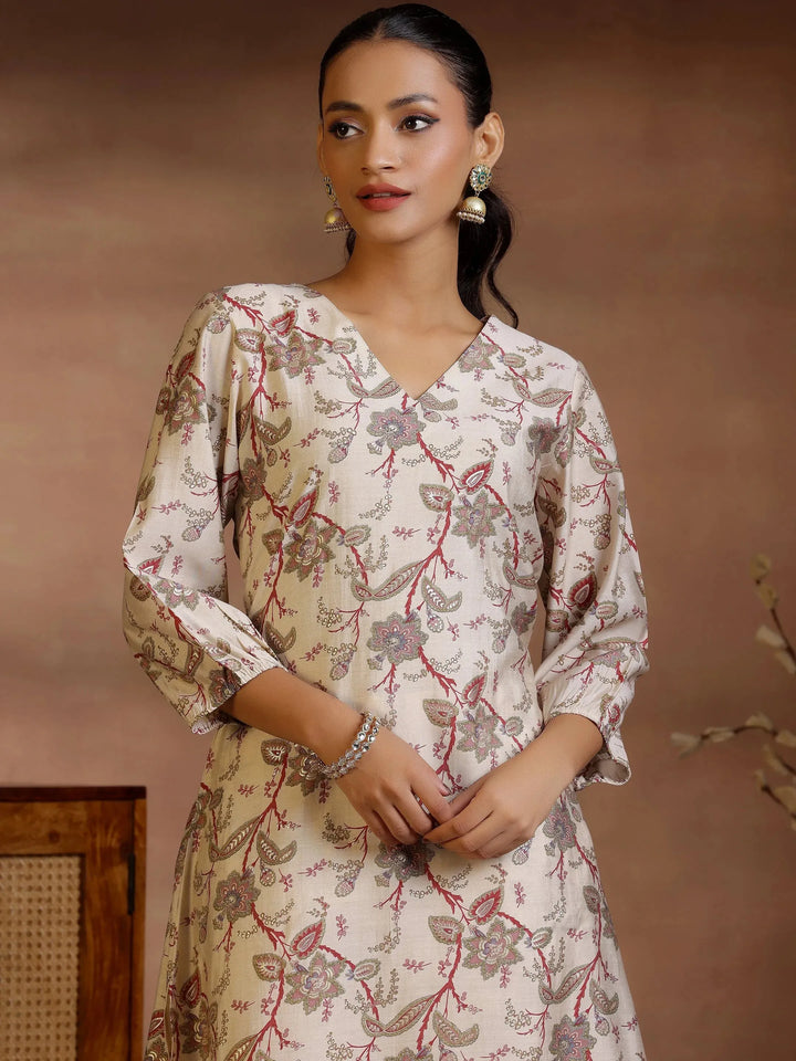 Our 2-piece beige printed silk blend co-ord set features an A-line kurta with a V-neckline and three-quarter sleeves. Complemented with trousers with a partially elasticated waistband and roomy pockets. Highlighted with captivating paisley and floral prints, this style is perfect for casual outings.