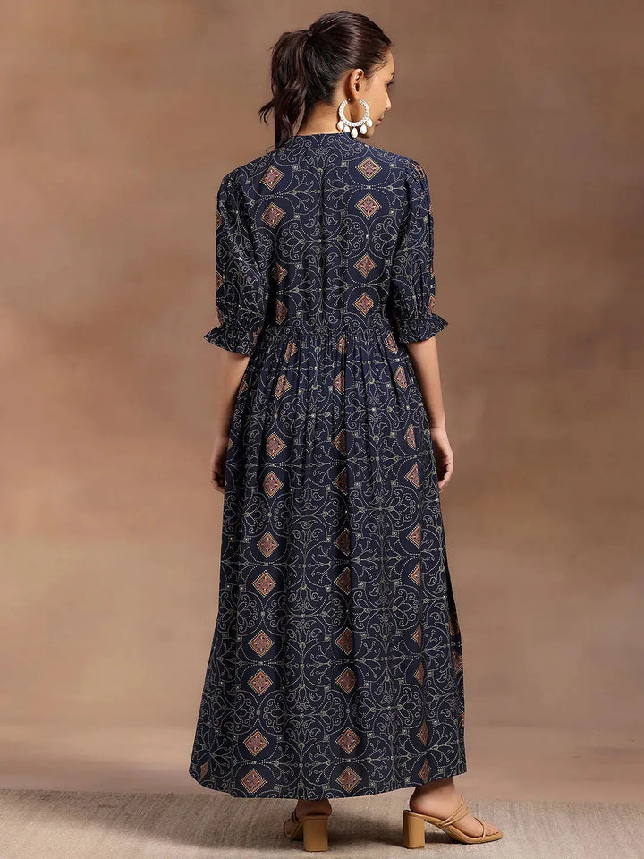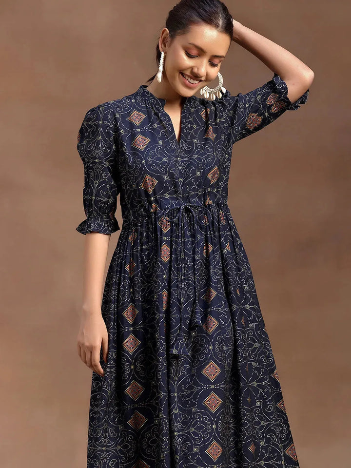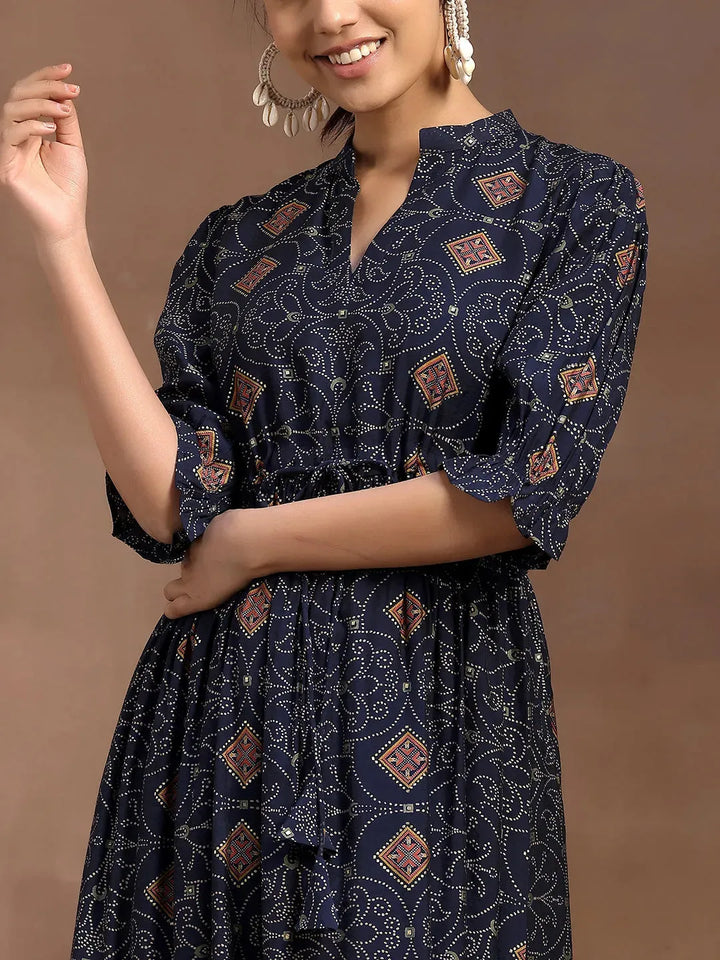 Our blue printed A-line silk dress features a mandarin notched neckline, three-quarter sleeves, and drawstring closure at the waist. Elevated with captivating ethnic motifs prints, this style is perfect for casual outings.