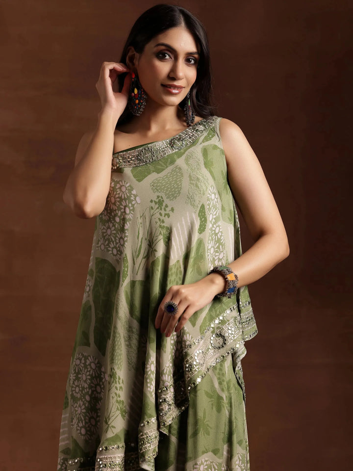 Our 2-piece green embellished co-ord set features an asymmetrical one-shoulder kurta with a strappy neckline. Complemented with flared palazzo pants with a partially elasticated waistband. Highlighted with intricate thread work and mirror accents, this style is perfect for festive celebrations.