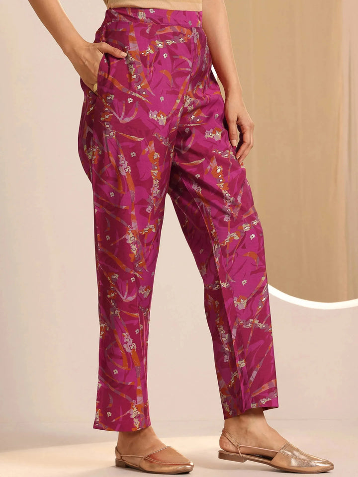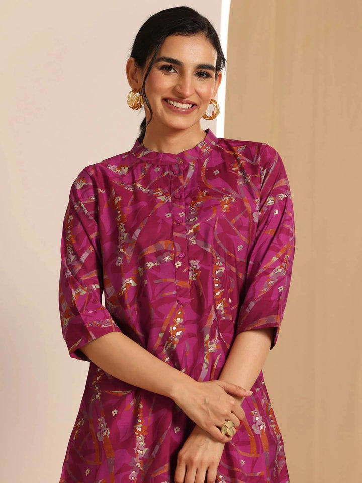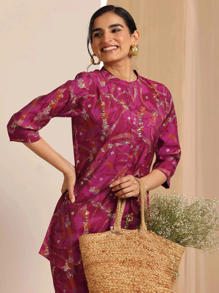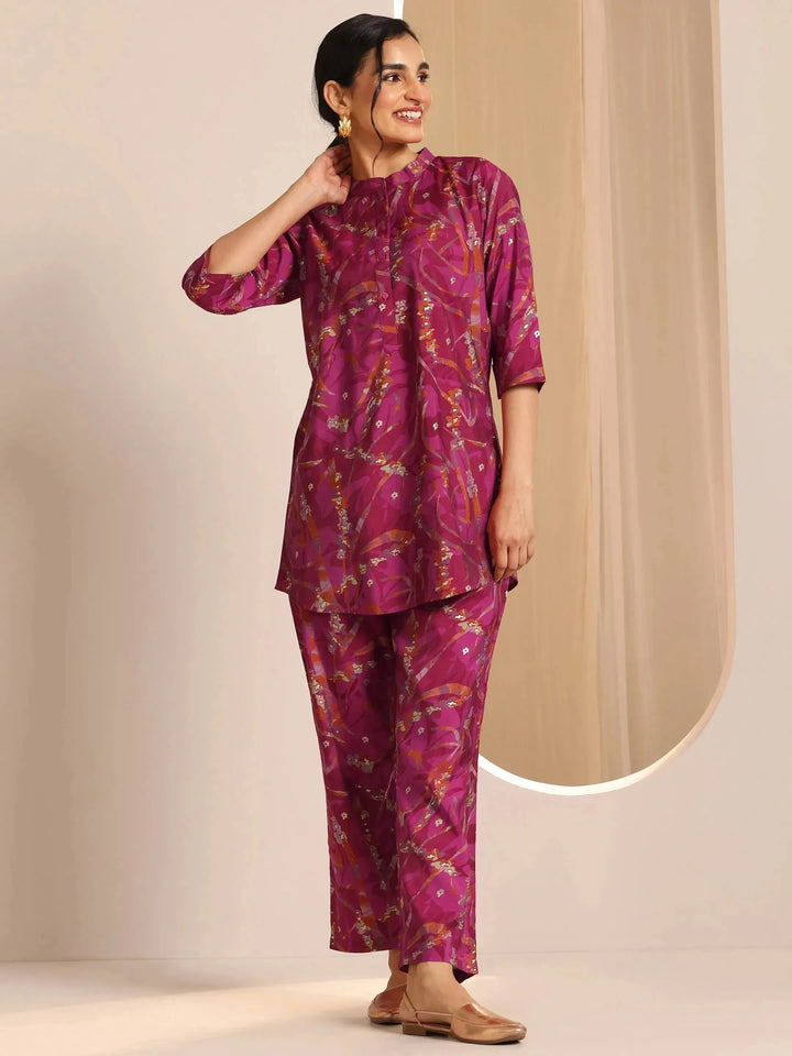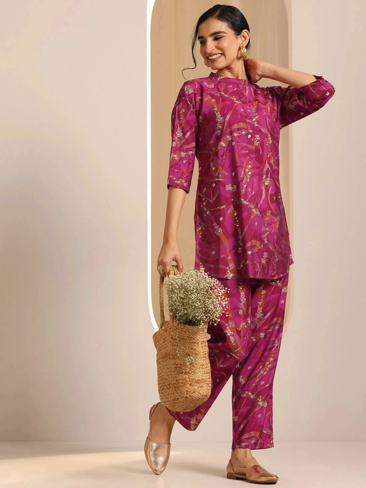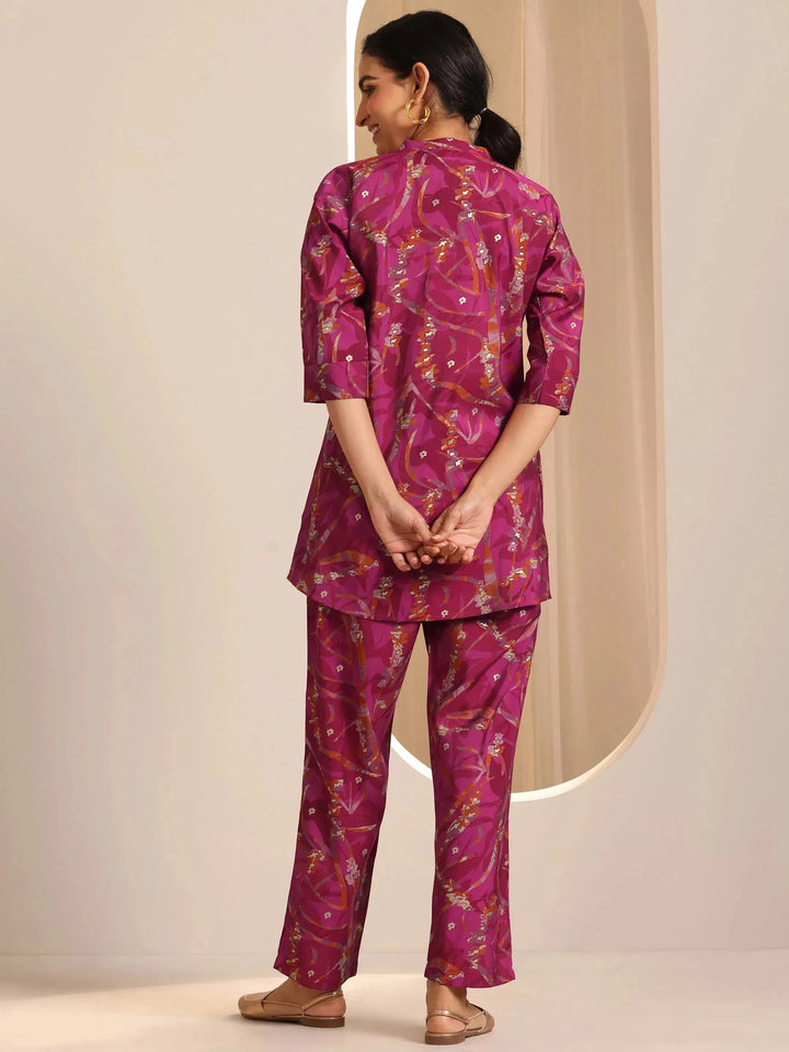Our 2-piece Magenta printed Silk Blend co-ord set features a Straight-fit Tunic with a Mandarin Collar neckline and Three-quarter sleeves. Complemented with matching Trousers with an Elasticated waistband and 2 pockets. Highlighted with Printed, this style is perfect for Casual wear.