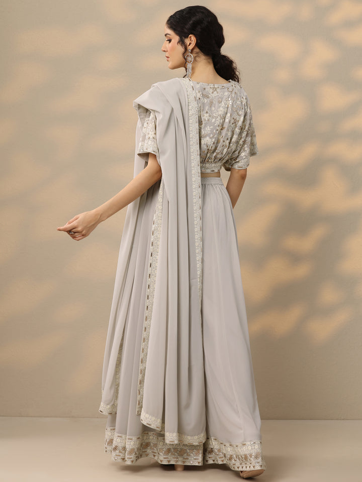 Our 3-piece grey embroidered poly georgette co-ord set features an embellished V-neck crop top with short sleeves and pleated detailing. Complemented with flared palazzos with a partially elasticated waistband and a dupatta. Adorned with intricate thread work and sequins, this charming style is perfect for light festivities.