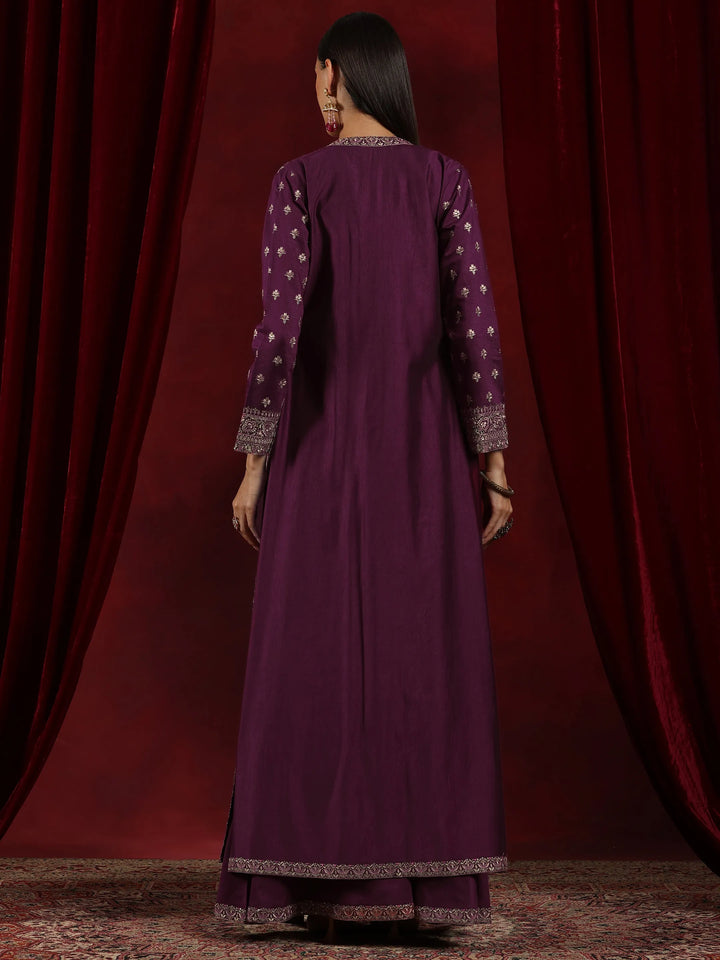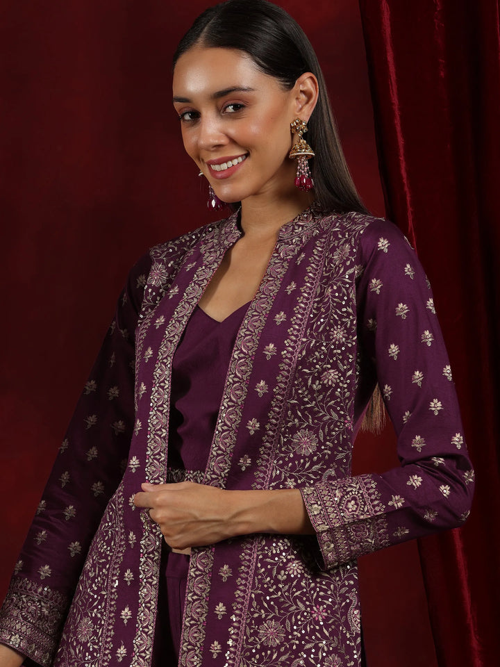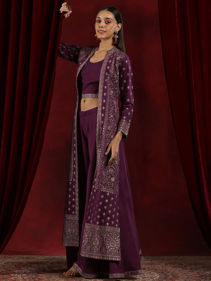 Our 3-piece Purple printed Silk Blend co-ord set features a Round Neck neckline and Long Sleeves. Complemented with matching Palazzos. This style is perfect for Dark Festive.