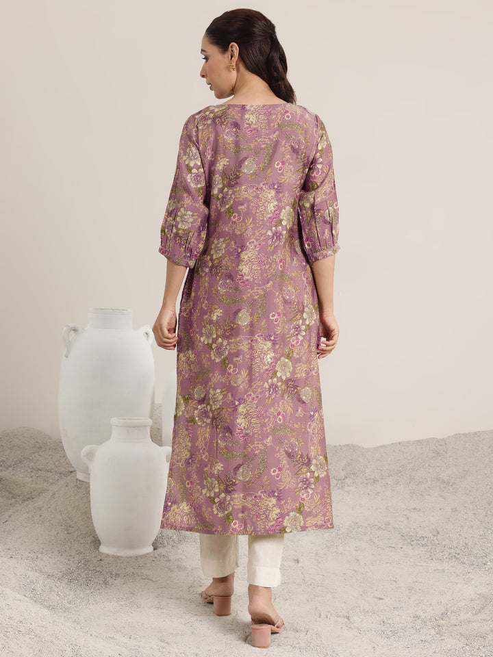 Our mauve printed silk blend straight kurta features a notched neckline and three-quarter bishop sleeves. Highlighted with floral prints, this elegant style is perfect for work and beyond.
