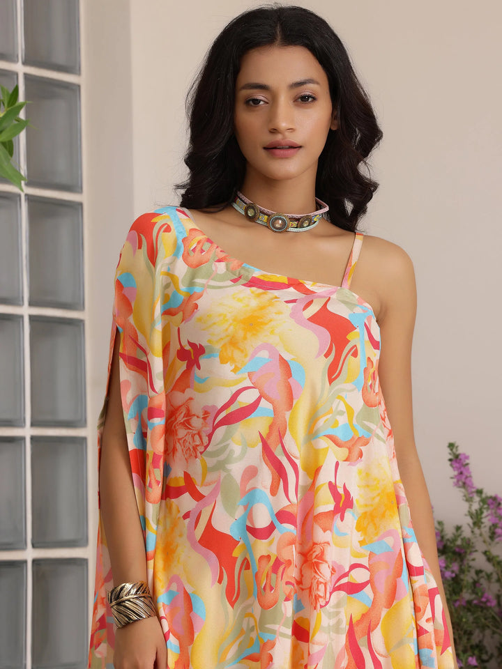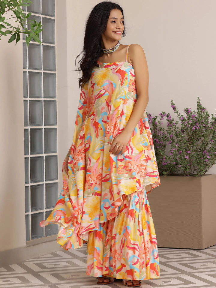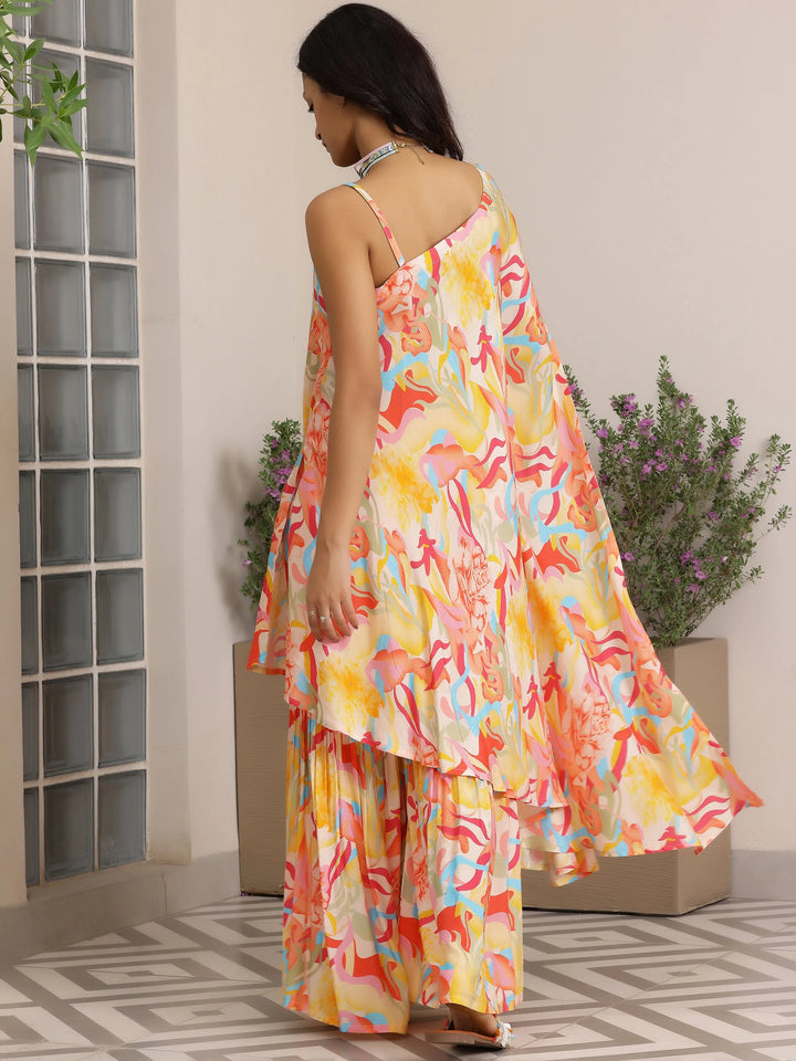 Our 2-piece multicolour printed silk blend co-ord set features an asymmetrical sleeveless tunic. Complemented with matching printed Sharara pants with a partially elasticated waistband. Highlighted with abstract prints, this style is perfect for casual outings.