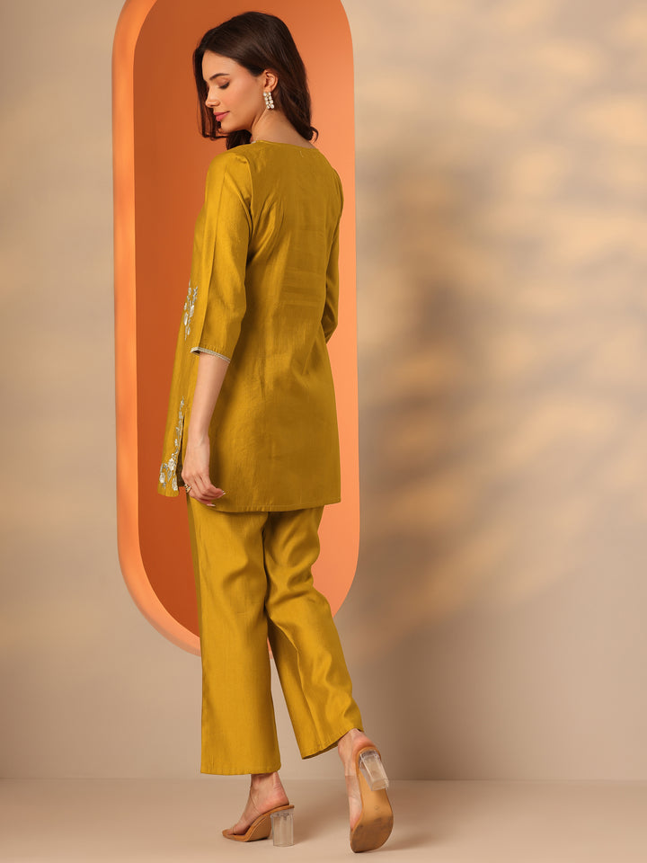Our 2-piece mustard silk blend co-ord set features a straight-fit tunic with a V-neck neckline and three-quarter sleeves. Complemented with matching trousers with a partially elasticated waistband and 2 pockets. Highlighted with floral embroidered details, this style is perfect for semi festive wear.