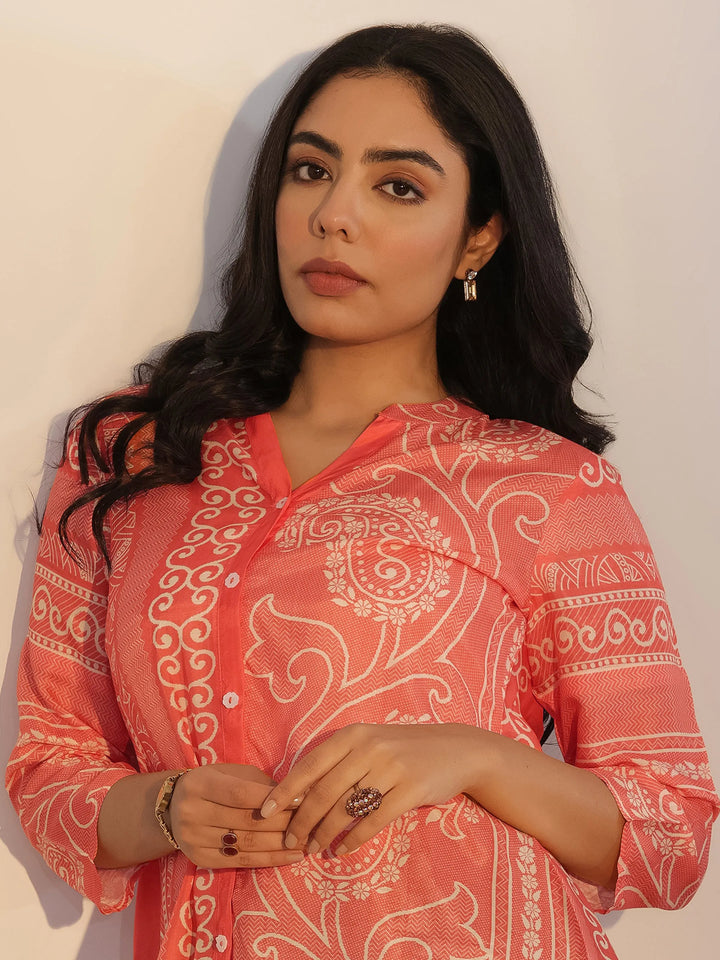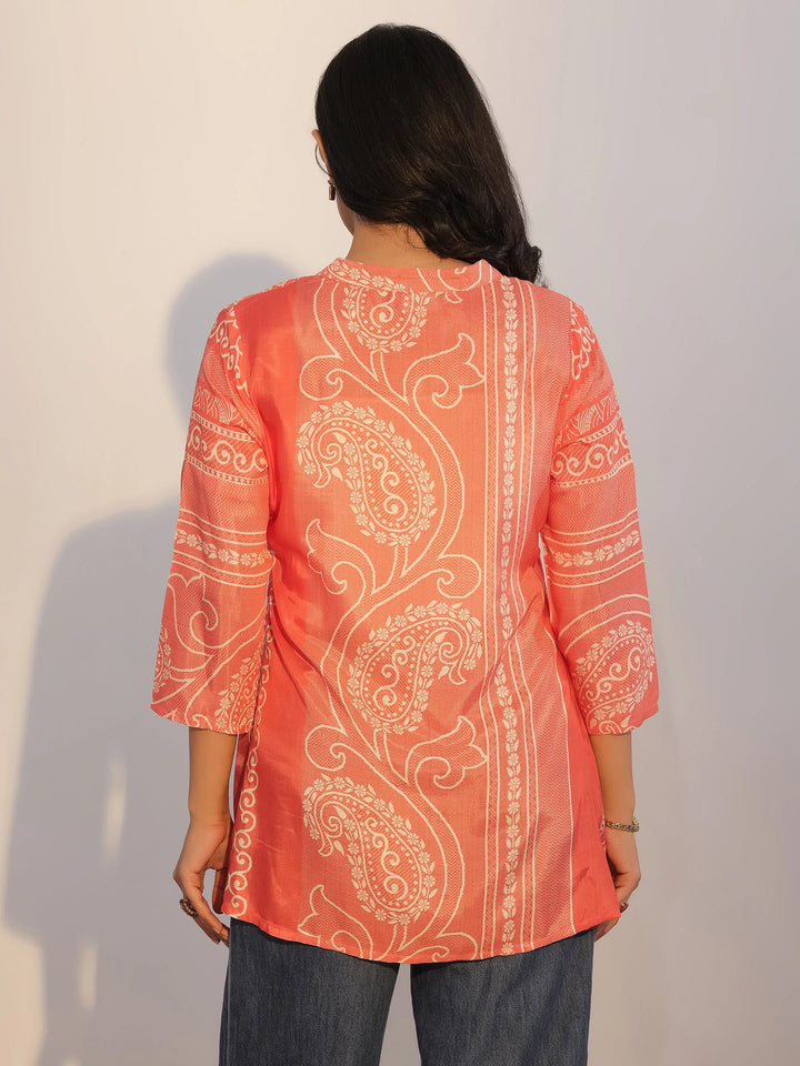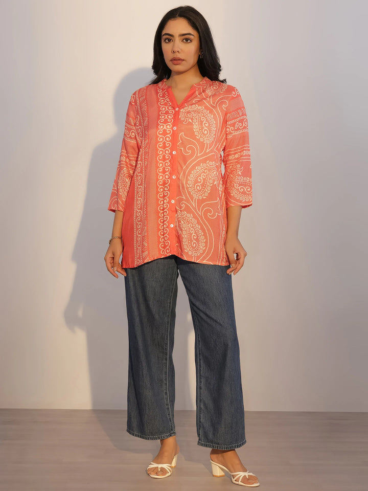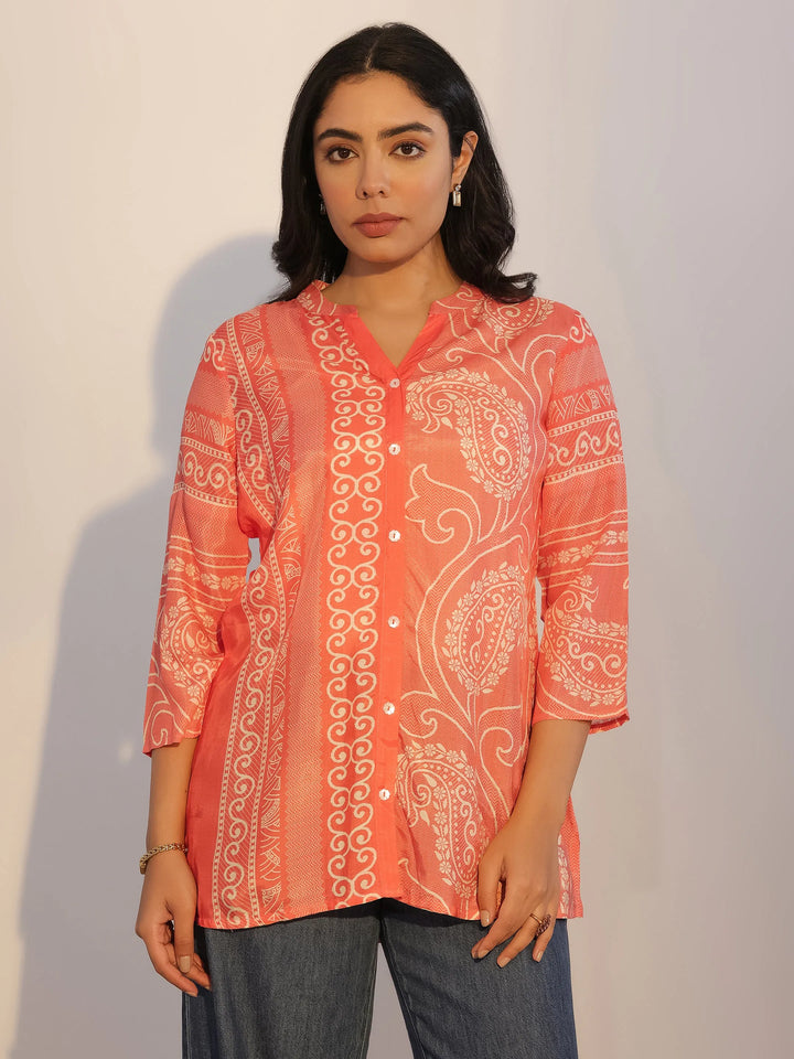 Our orange printed silk kurti features a mandarin notched neckline with buttoned-down detailing and three-quarter sleeves. Highlighted with ethnic prints, this style is perfect for casual outings.