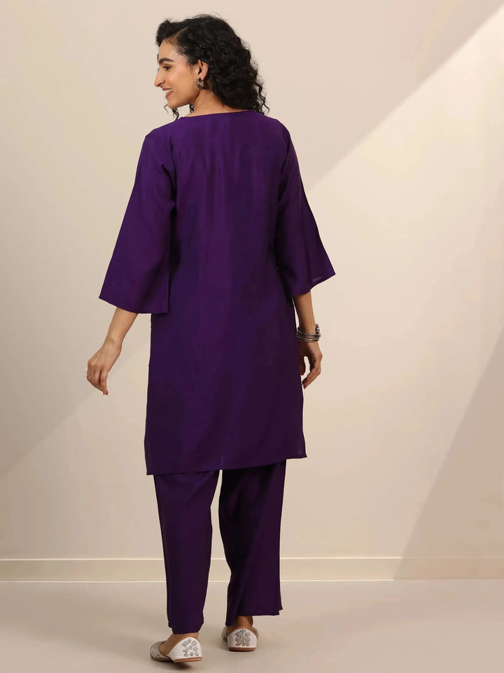 Our 2-piece Purple Silk Blend Straight-fit features a Keyhole Neckline, Regular Sleeves, and statement yoke. Complemented with Palazzo Pants with an Elasticated waistband. Adorned with Embroidered accents, this style is perfect for Semi festive occasions.