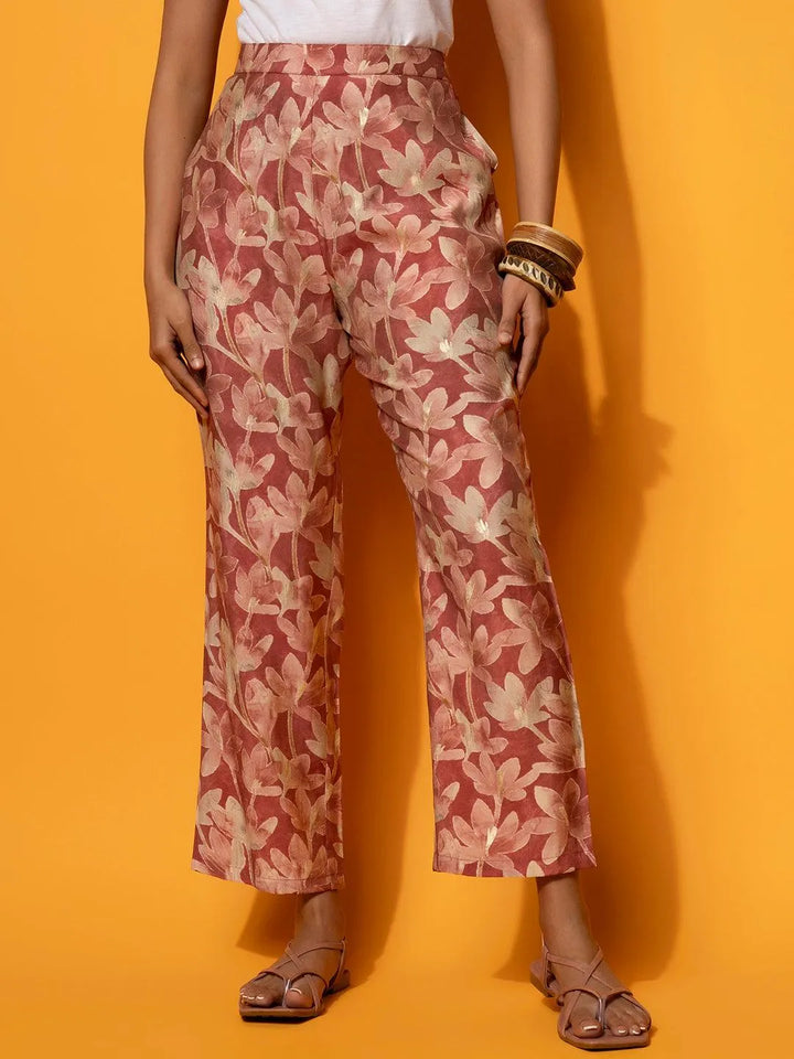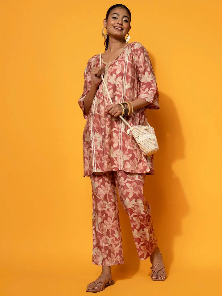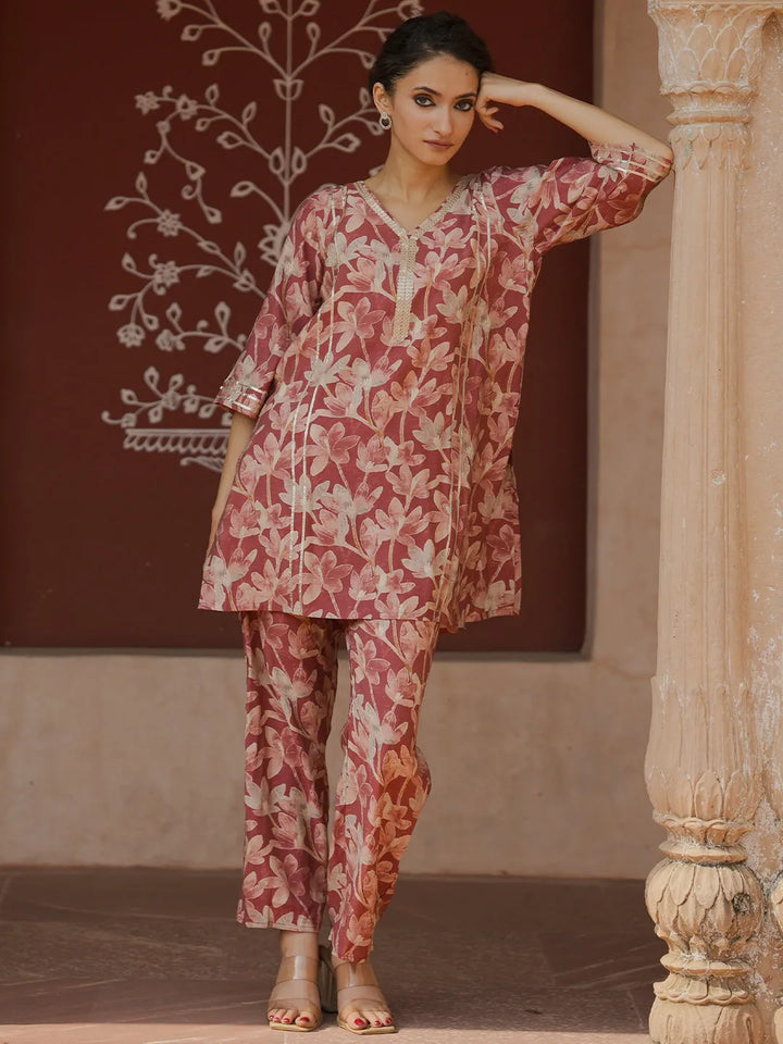 Our 2-piece cream printed silk blend Co-Ord Set features a straight-fit kurta with a V-neckline and three-quarter flared sleeves. Complemented with trousers with a partially elasticated waistband. Adorned with sequins, Gota Patti detailing, and floral prints, this style is perfect for light festivities.