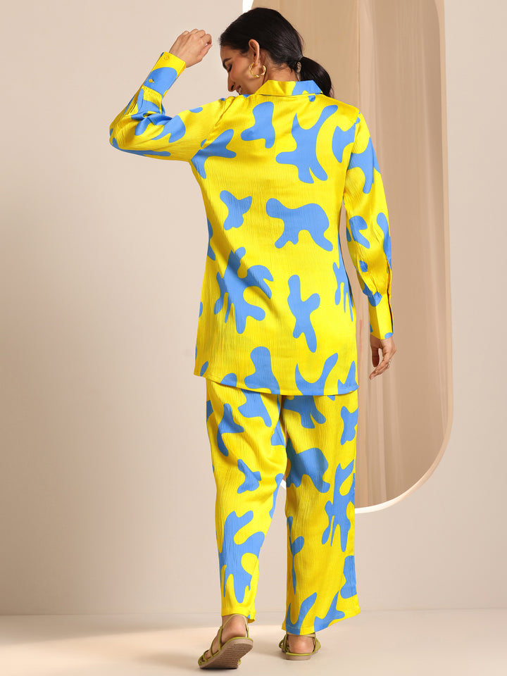 Our 2-piece yellow and blue printed silk blend co-ord set features a straight-fit shirt with a shirt collar neckline and long sleeves. Complemented with matching palazzos with an elasticated waistband. Highlighted with printed embellishments, this style is perfect for casual wear.