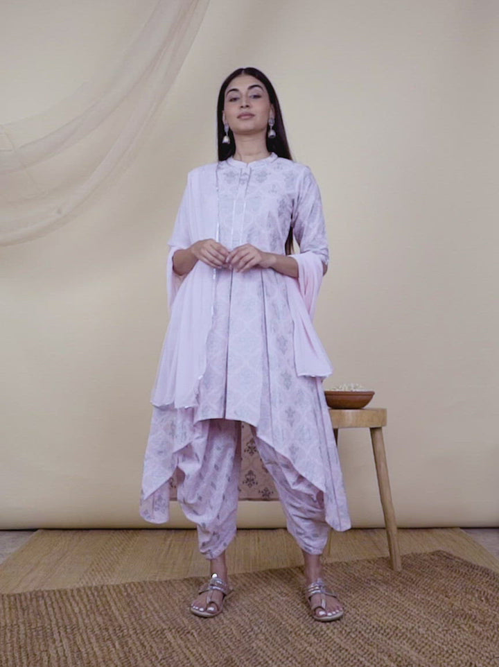 This 2-piece set includes our Khari print asymmetrical kurta and matching dhoti pants. Crafted in cotton for simple comfort. Perfect for festive celebrations.