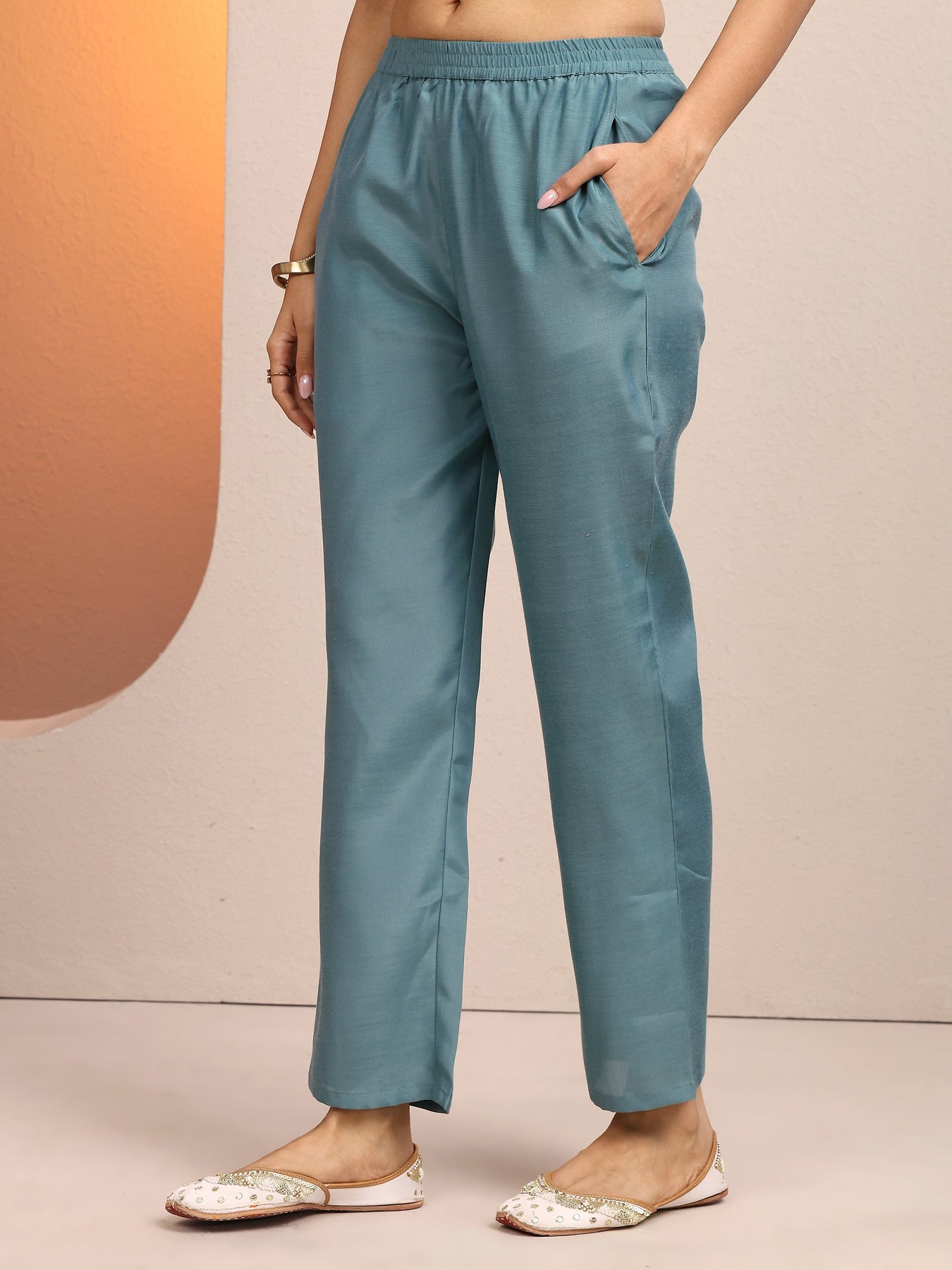 Our 3-piece teal organza straight-fit kurta set features a round neckline, regular sleeves, and statement yoke. Complemented with lining and straight pants with a partially elasticated waistband and 2 pockets, and an embroidered dupatta. Adorned with floral embroidered, this style is perfect for festive occasions.