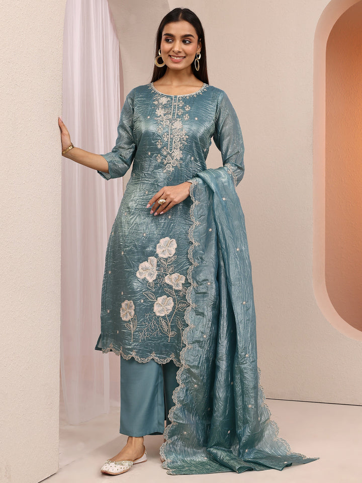 Blue Embroidered Organza Straight Suit Set With Dupatta