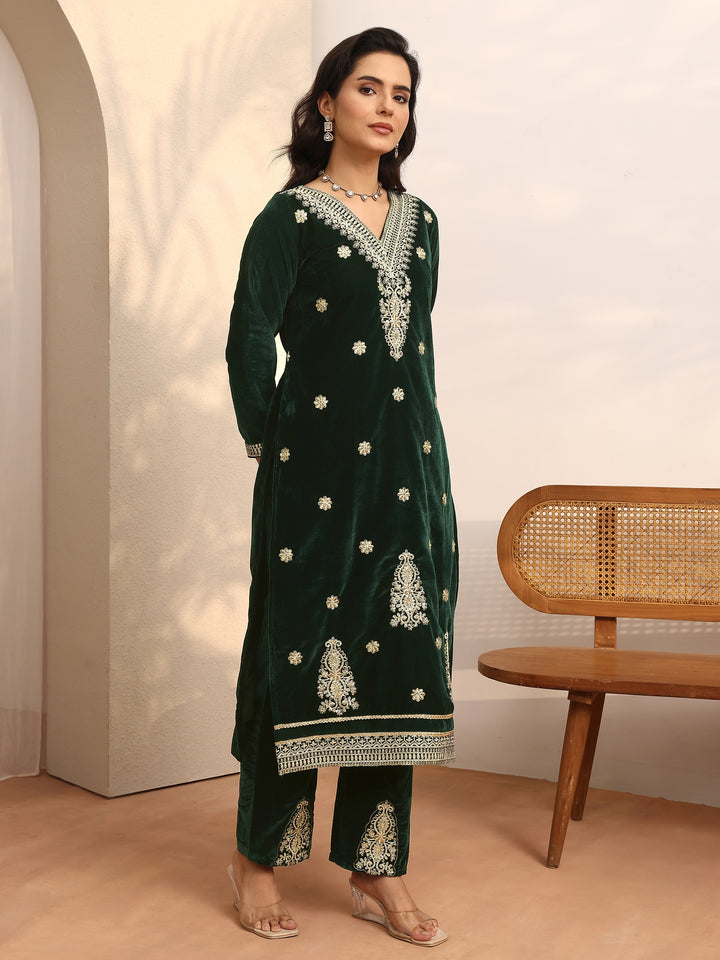 Green Embroidered Velvet Straight Suit Set With Dupatta