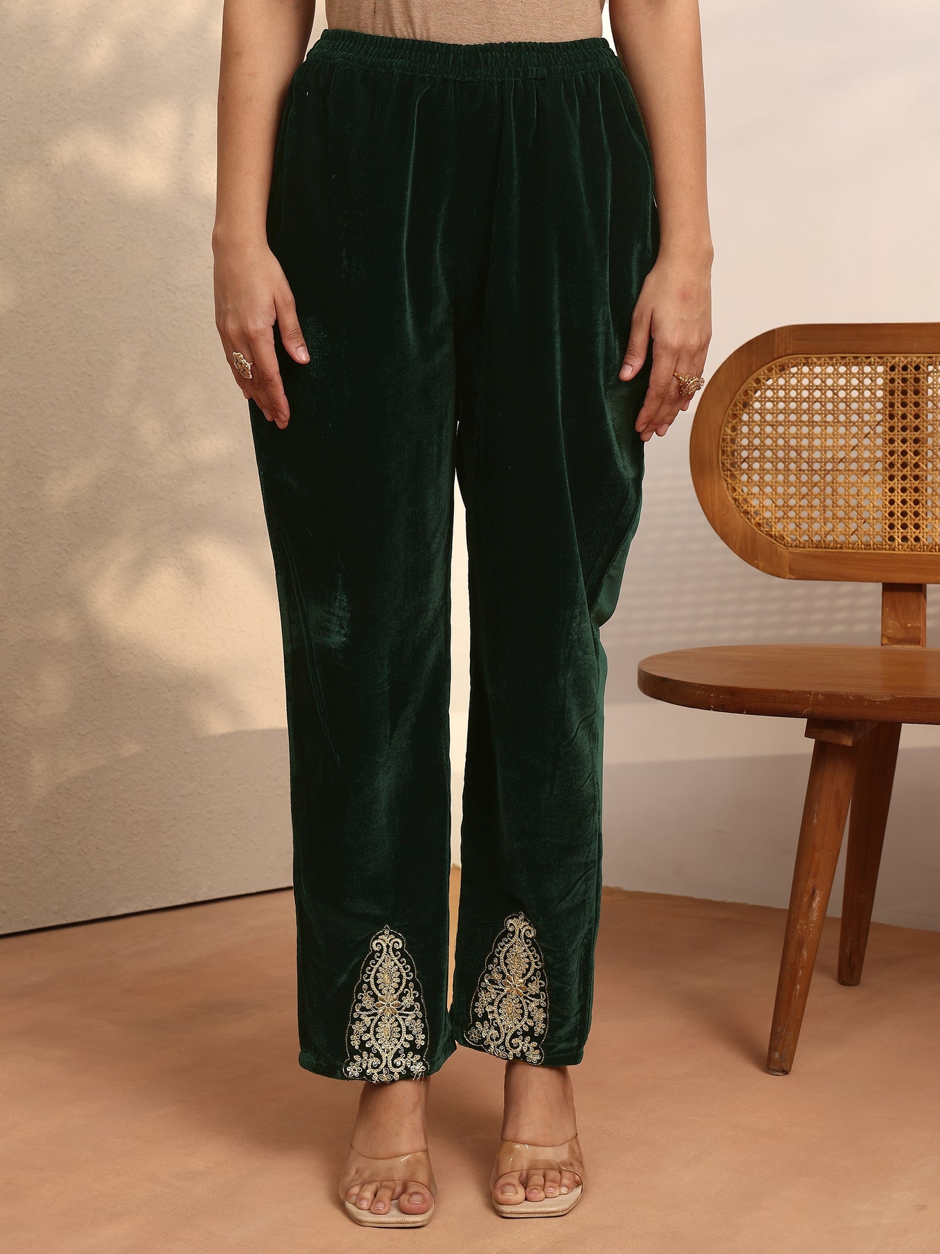 Our 3-piece green velvet straight-fit kurta set features a V-neckline, regular sleeves, and statement yoke. Complemented with straight pants with a partially elasticated waistband and 2 pockets, and an embroidered dupatta. Adorned with ethnic motif zari embroidered, this style is perfect for dark festive occasions.