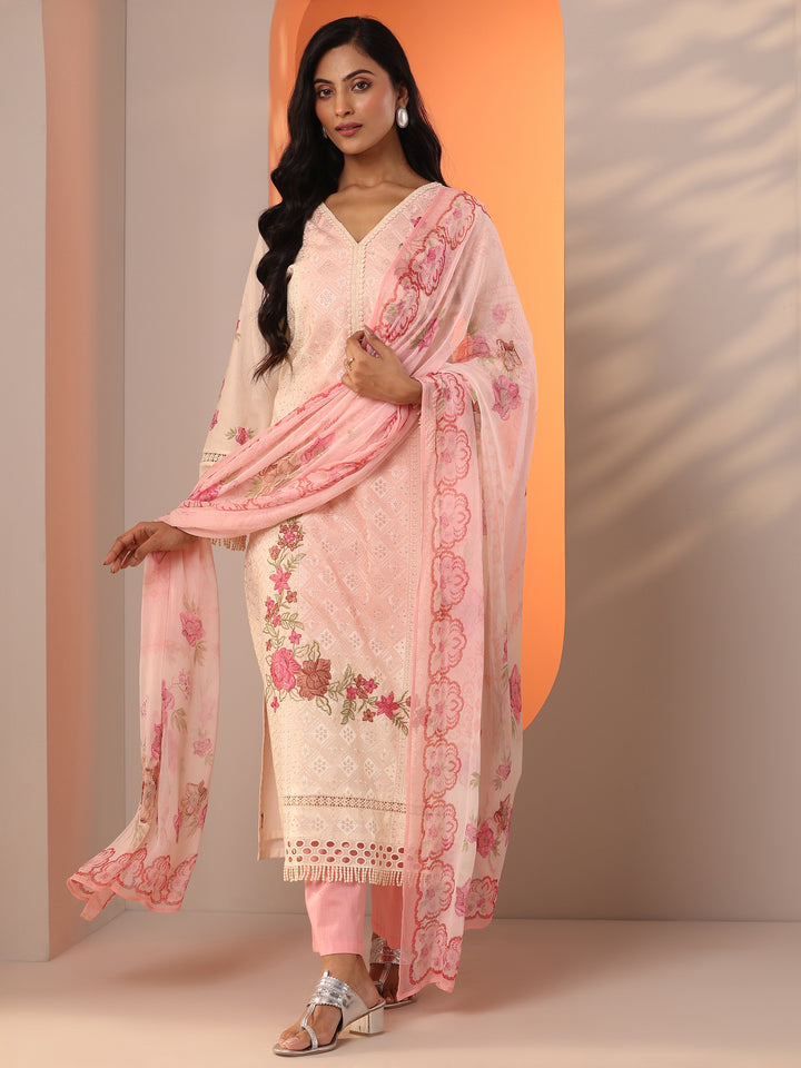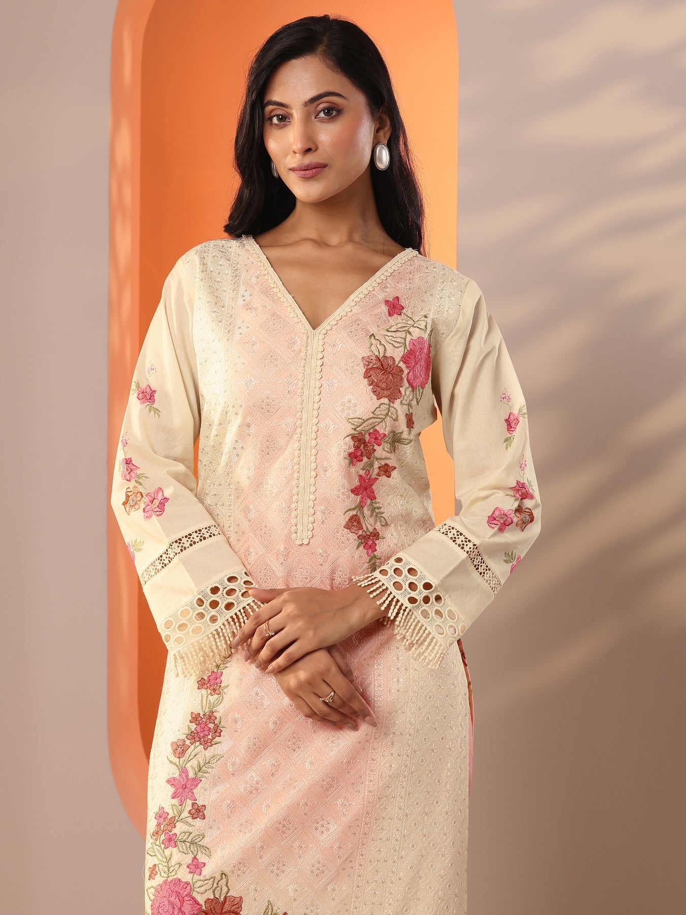 Off White Embroidered Cotton Straight Suit Set With Dupatta