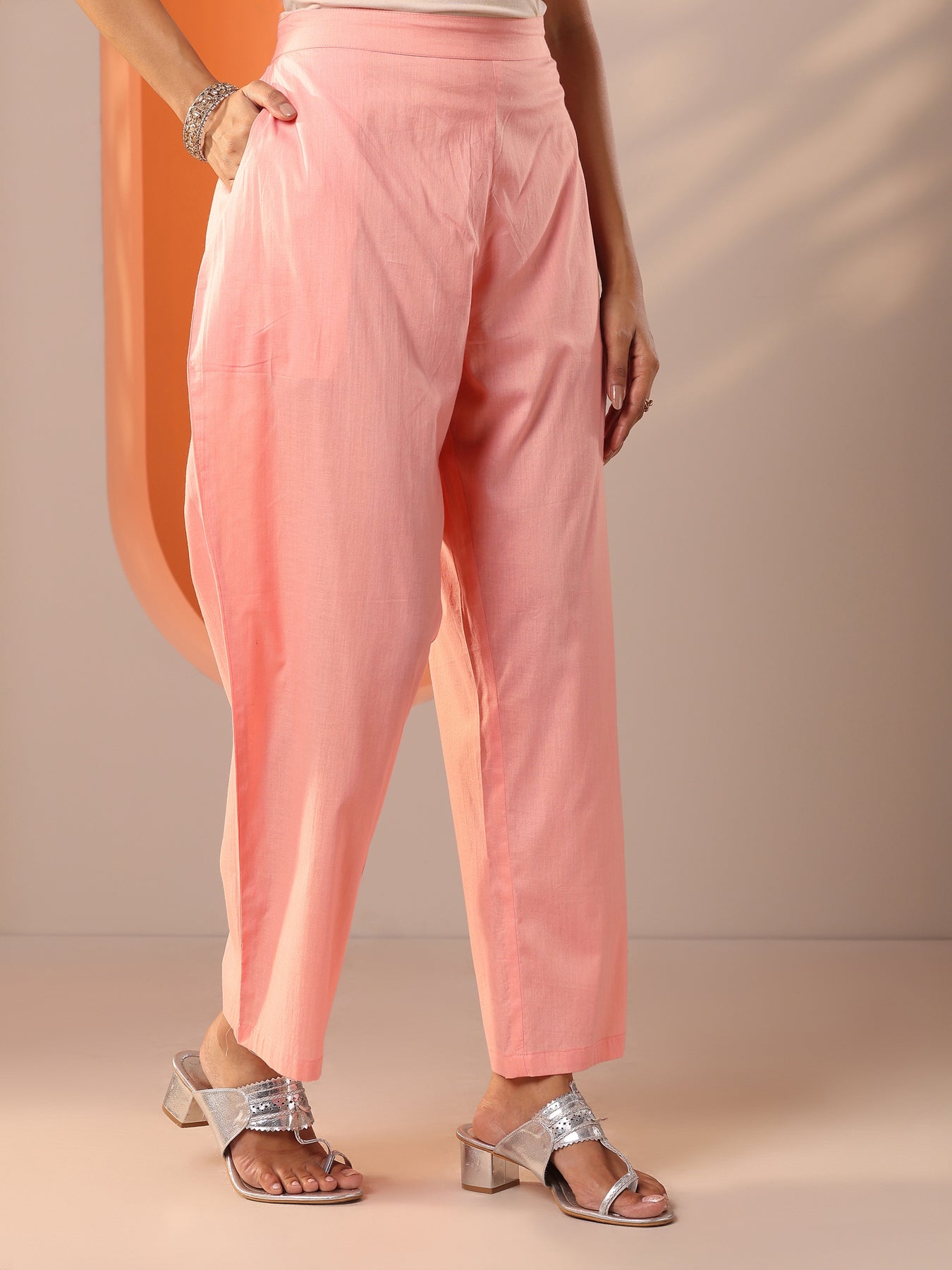 Our 3-piece peach pink cotton kurta set features a straight-fit design with a V-neckline, regular sleeves, and a statement yoke. Complemented with straight pants with a partially elasticated waistband and a printed dupatta. Adorned with floral embroidery, this style is perfect for festive occasions.