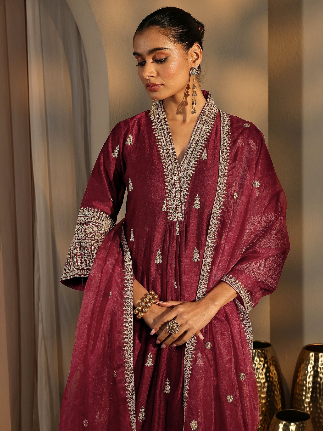 Maroon Embroidered Silk Blend A-Line Suit Set With Dupatta
