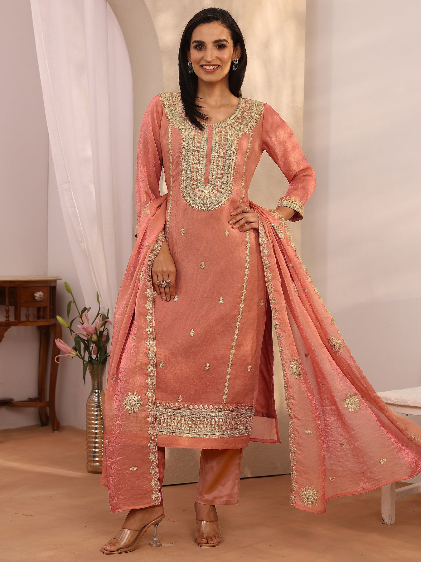 Peach Embroidered Organza Straight Suit Set With Dupatta