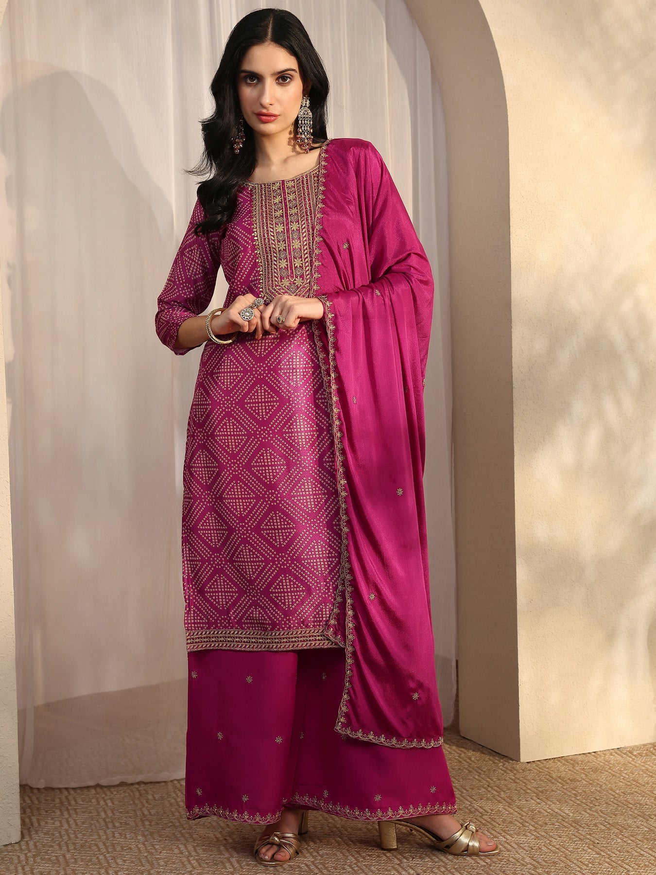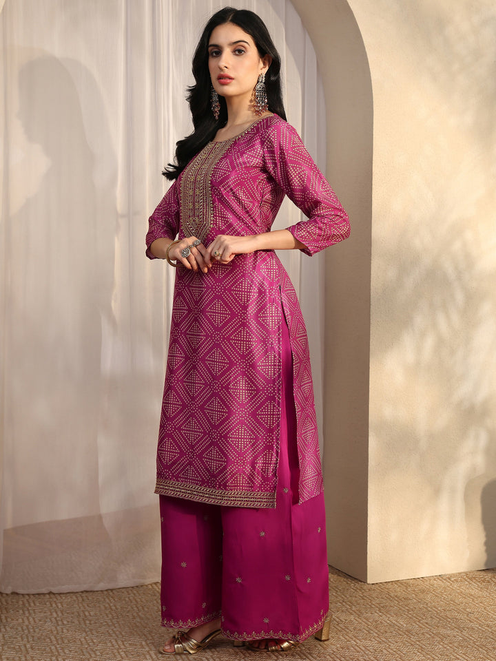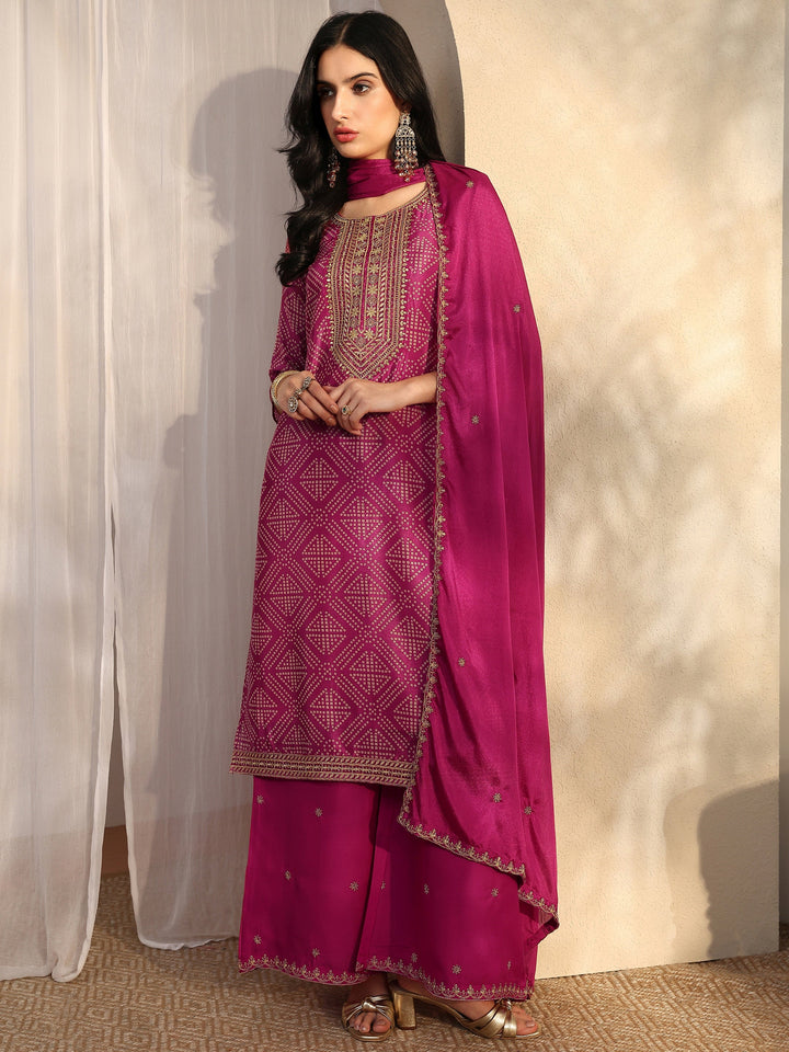 Our 3-piece magenta Chinon straight-fit kurta set features a round neckline, regular sleeves, and statement yoke. Complemented with palazzo pants with a partially elasticated waistband and an embroidered dupatta. Adorned with bandhani printed, this style is perfect for dark festive occasions.