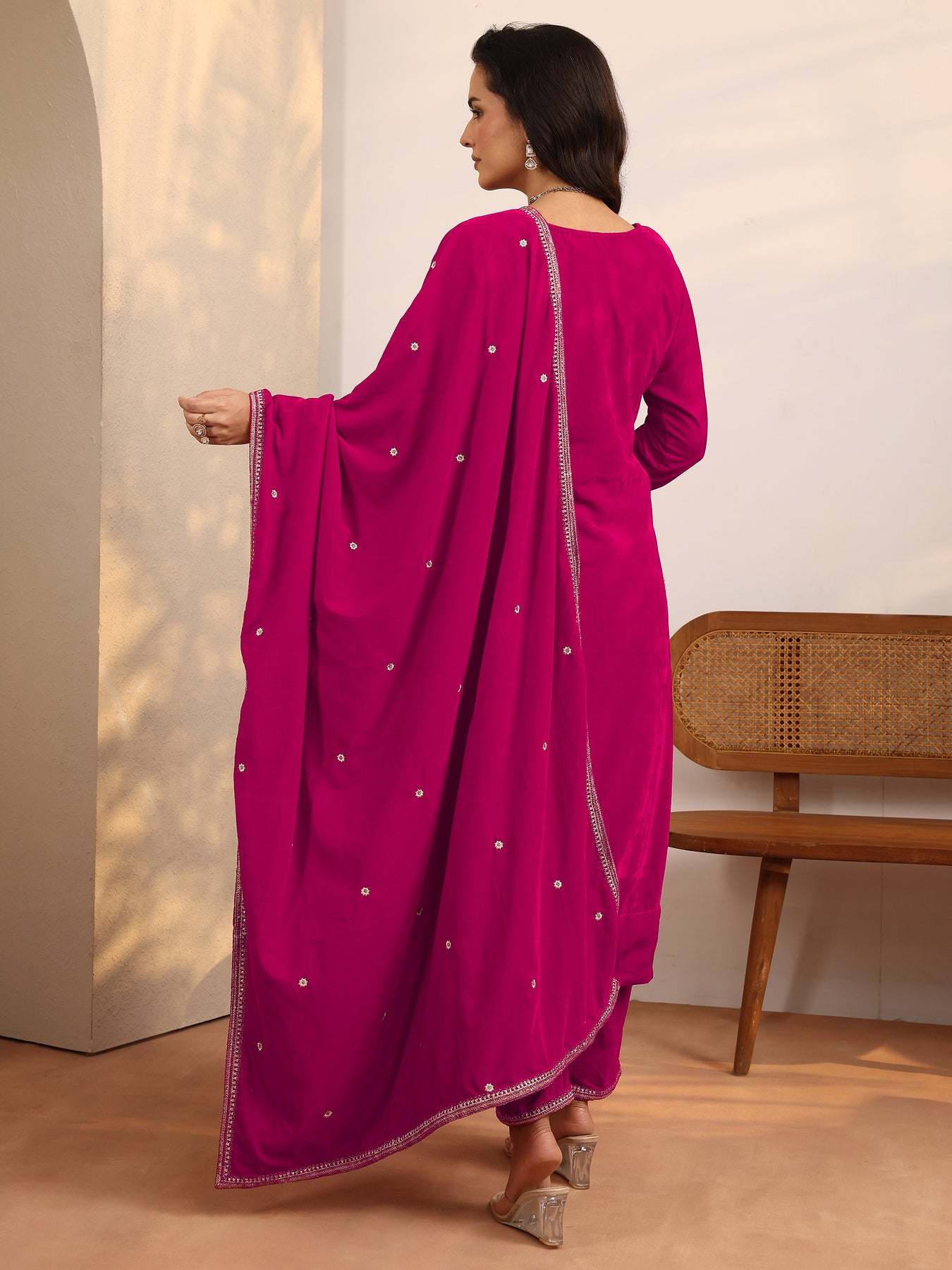 Our 3-piece magenta velvet straight-fit kurta set features a V-neckline, regular sleeves, and statement yoke. Complemented with salwar pants with a partially elasticated waistband and an embroidered dupatta. Adorned with floral emnbroidered, this style is perfect for festive occasions.
