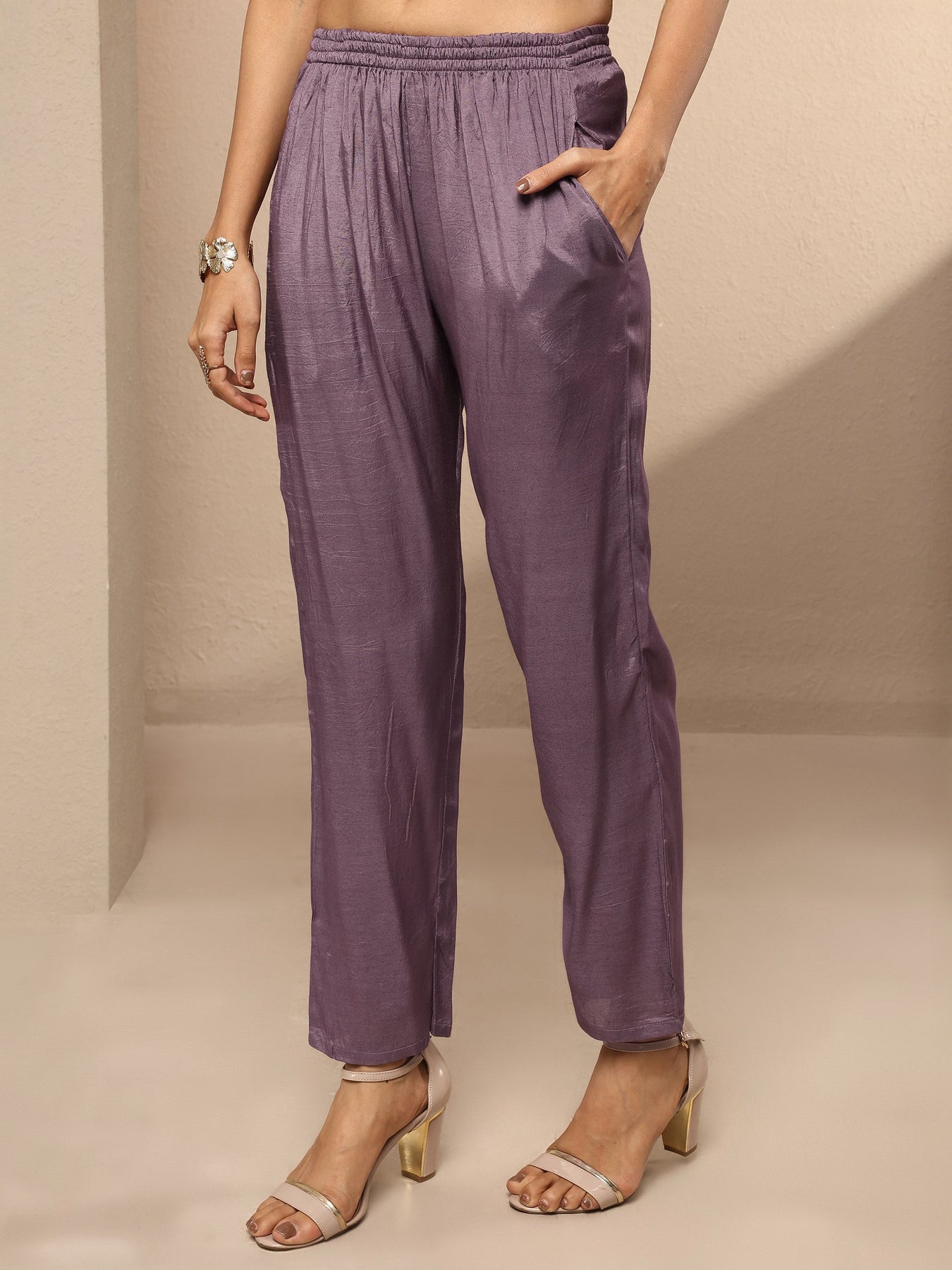 Our 3-piece Purple Silk blend Straight-fit Kurta Set features a V-Neckline, Regular Sleeves, and statement yoke. Complemented with Straight Pants with a Partially Elasticated waistband and 2 pockets, and an Embroidered dupatta. Adorned with floral printed, this style is perfect for Festive occasions.