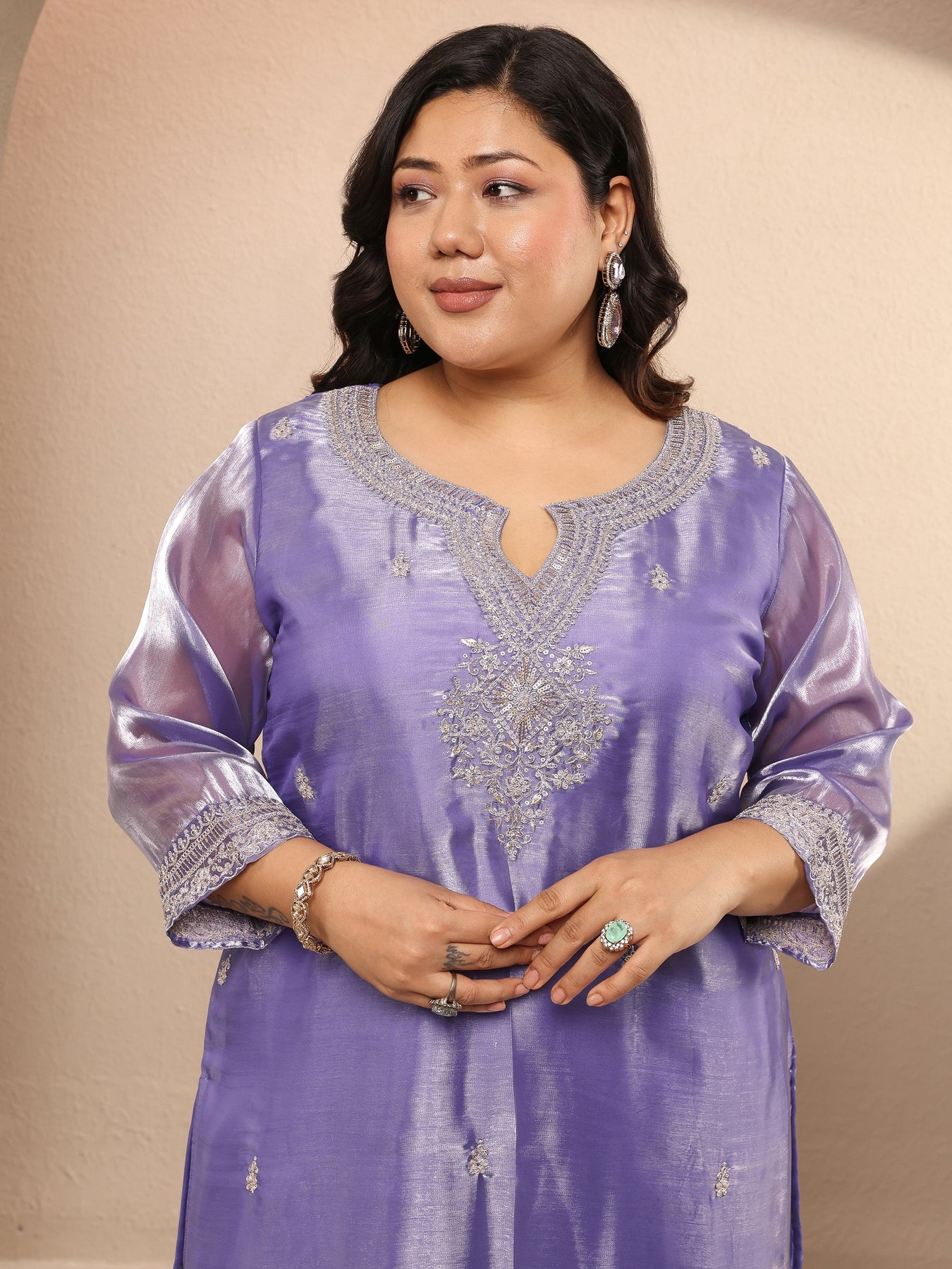Our 3-piece Lavender Organza Straight-Fit Kurta Set features a sweetheart Neckline, Regular Sleeves, and statement yoke. Complemented with Lining and Straight Pants with a Partially Elasticated waistband and 2 pockets, and an Embroidered dupatta. Adorned with ethnic motif embroidered, this style is perfect for Dark Festive.