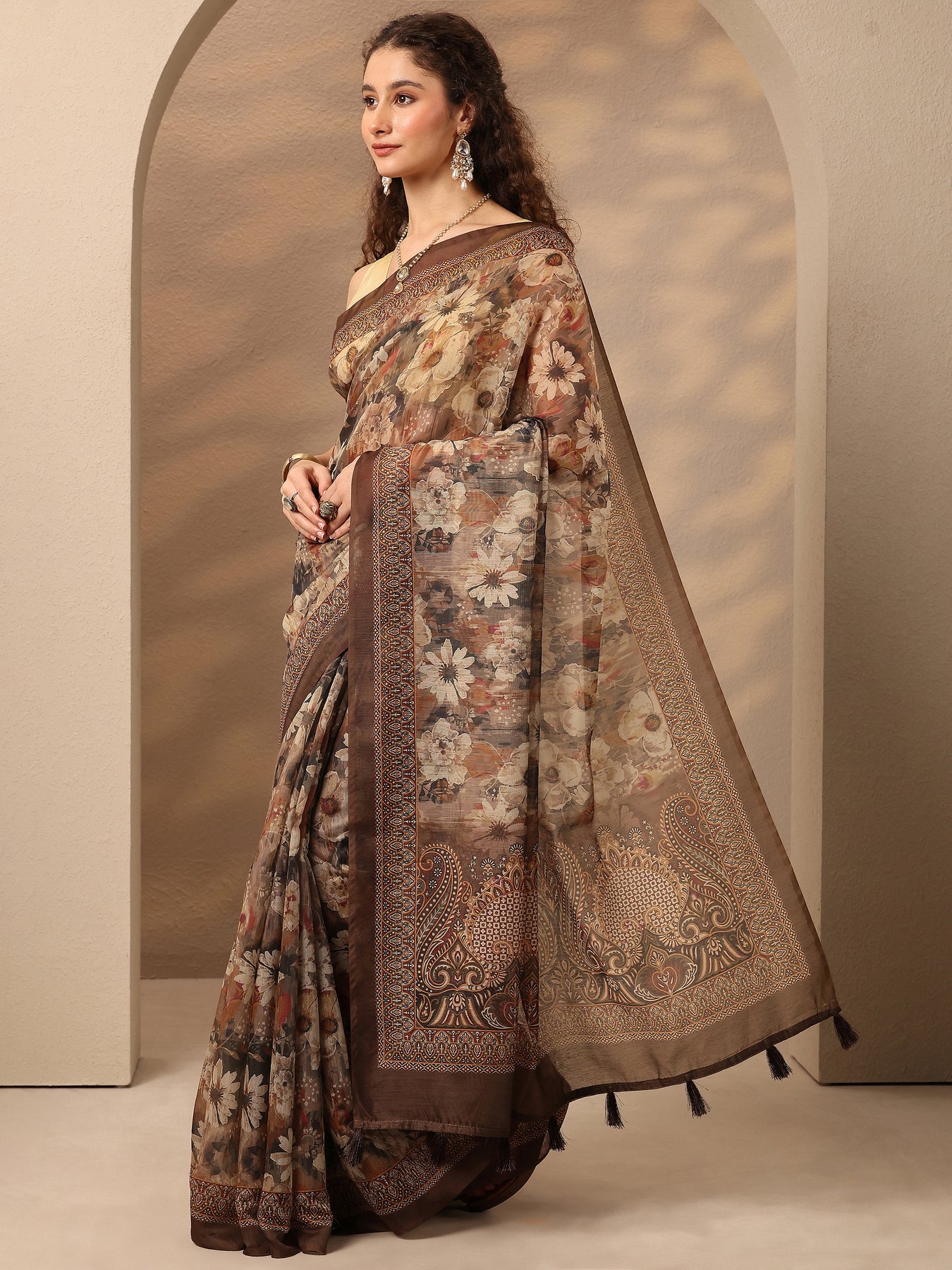 Our Brown Printed Silk Blend Saree Features Captivating Floral. Complemented With An Unstitched Blouse Piece. This Charming Saree Is Perfect For Festive Occasions.