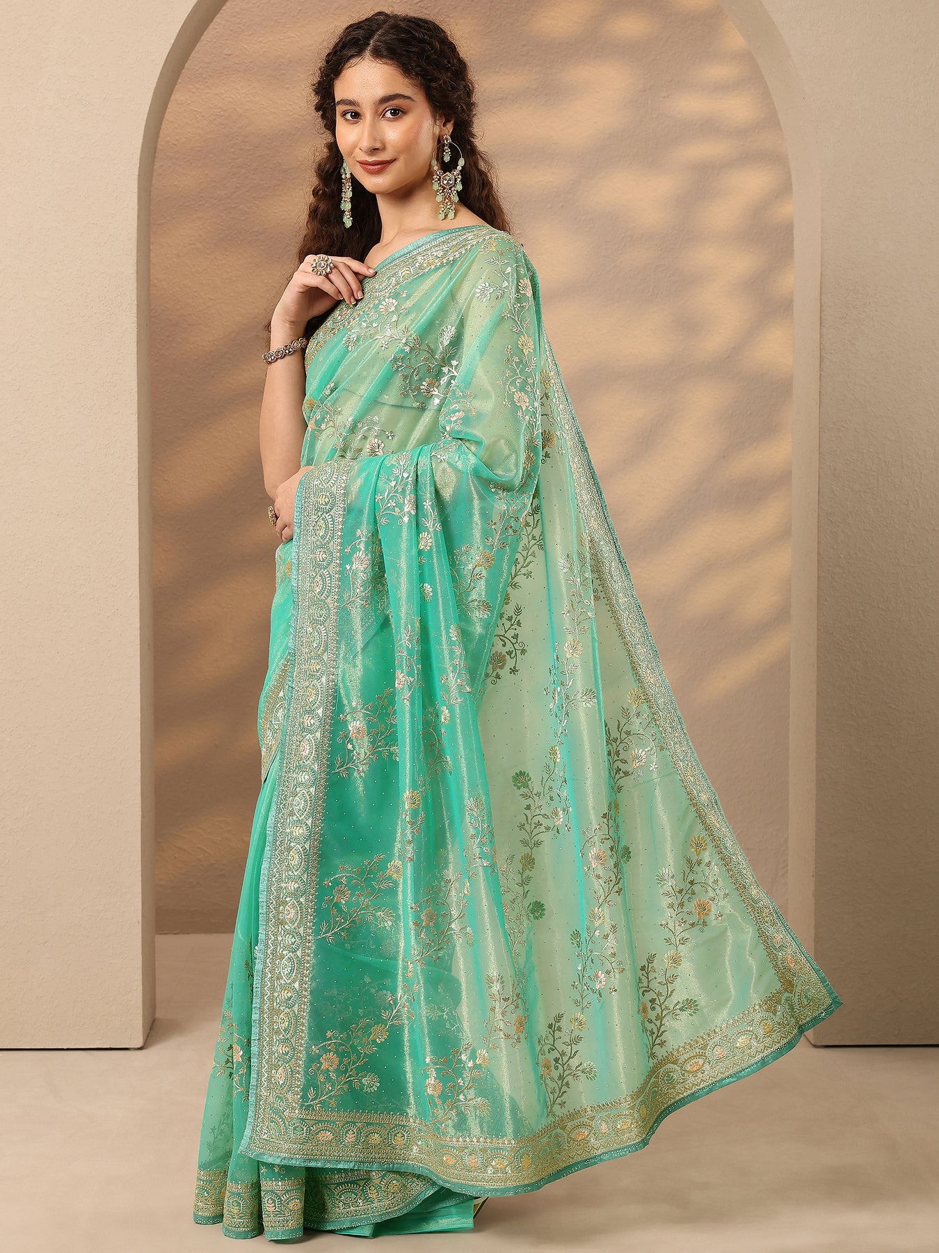 Our Green Embroidered Nylon Saree Features Captivating Floral. Complemented With An Unstitched Blouse Piece. This Charming Saree Is Perfect For Festive Occasions.