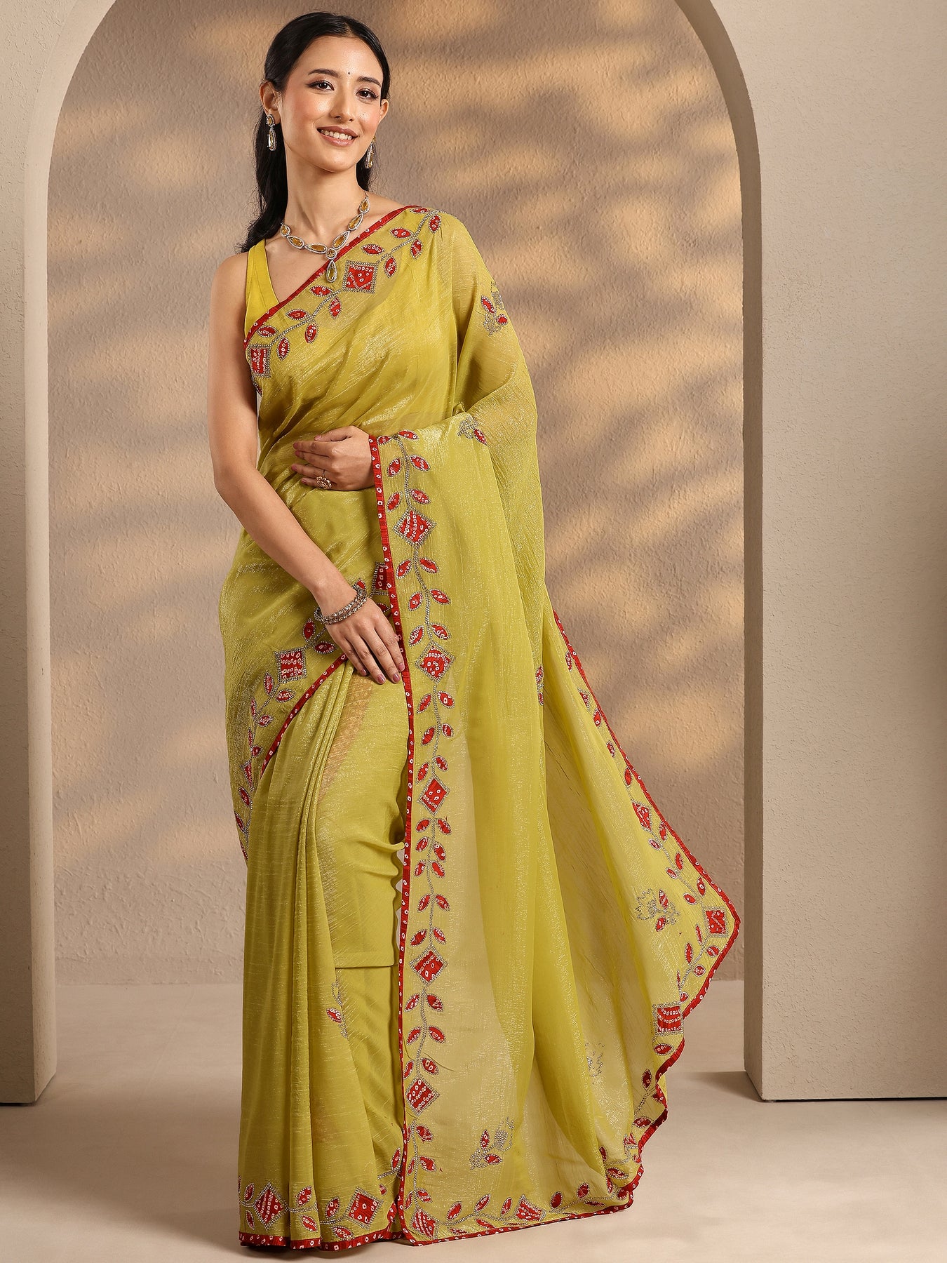 Our Lime Green printed Silk blend saree features captivating embellishments. Complemented with a Unstitched Blouse Piece. This charming saree is perfect for festive occasions.