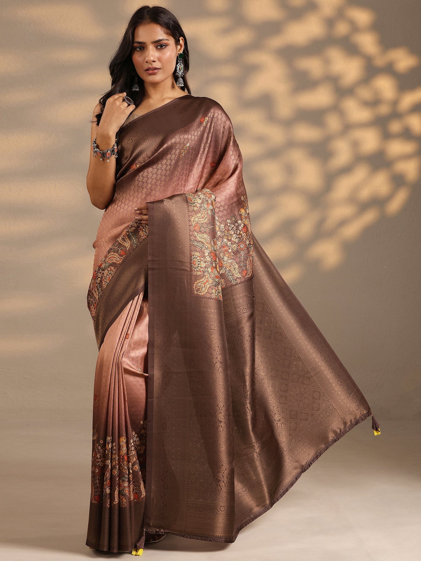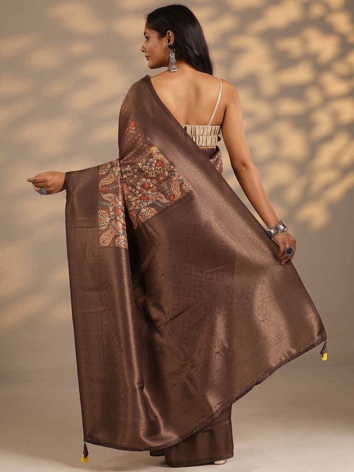 Our Coffee Brown Printed Silk Blend Saree Features Captivating Floral Print. Complemented With A Blouse Piece. This Charming Saree Is Perfect For Festive Occasions.