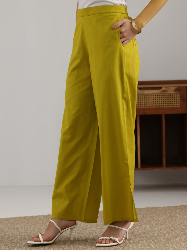 Our 3-piece olive cotton straight-fit kurta set features a square neckline, no sleeves shoulder, and statement yoke. Complemented with straight pants with a partially elasticated waistband and 2 pockets, and a printed dupatta. Adorned with ethnic motif printed accents, this style is perfect for casual wear.