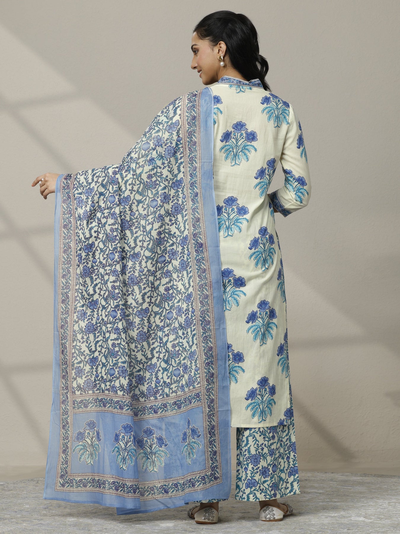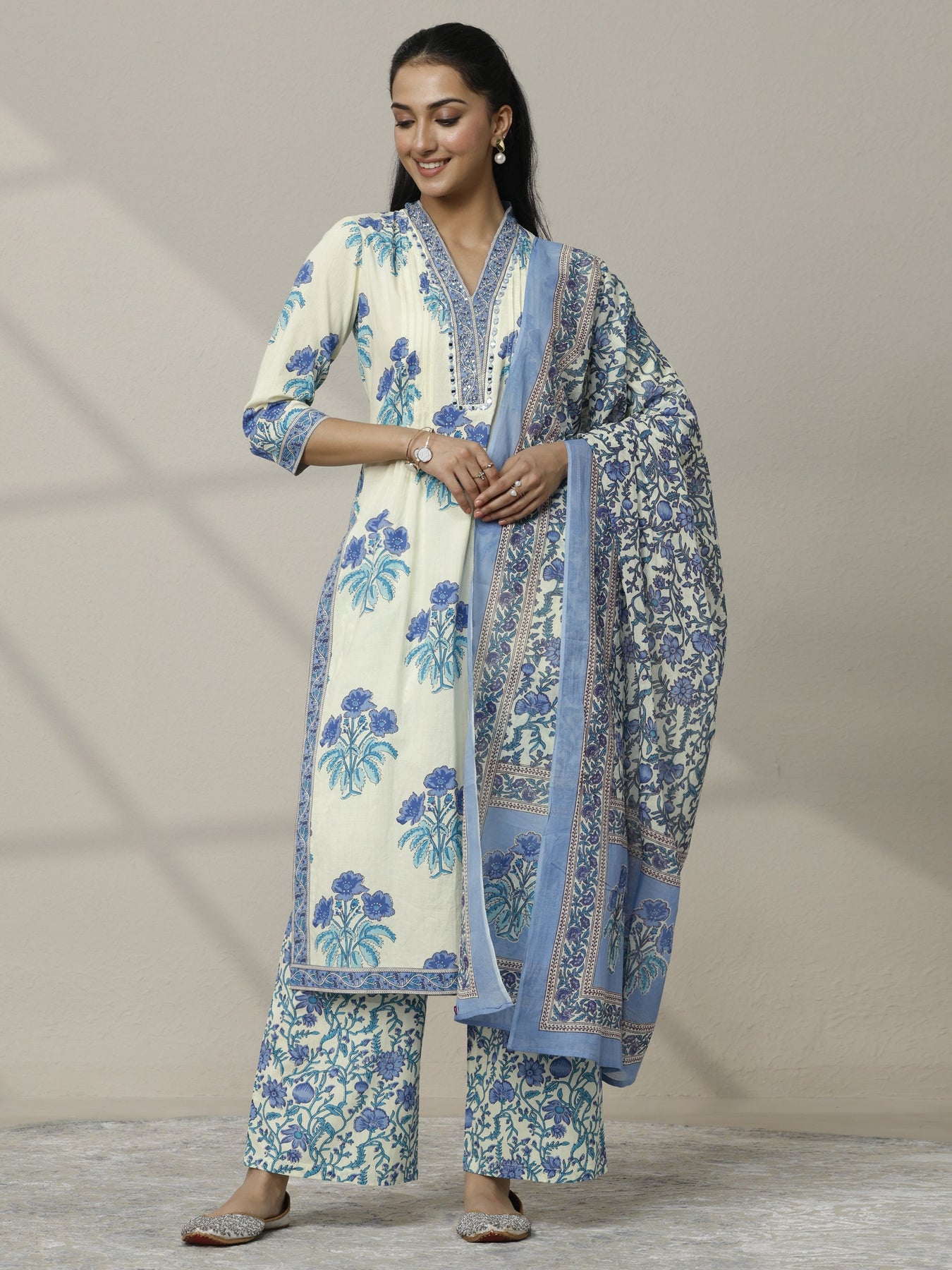Our 3-piece Off White and Blue Cotton Straight-Fit Kurta Set features a V-Neckline, Regular Sleeves, and statement yoke. Complemented with Palazzo Pants with a Partially Elasticated waistband and 2 pockets, and a Printed dupatta. Adorned with floral printed, this style is perfect for Work Wear and Casual Wear.