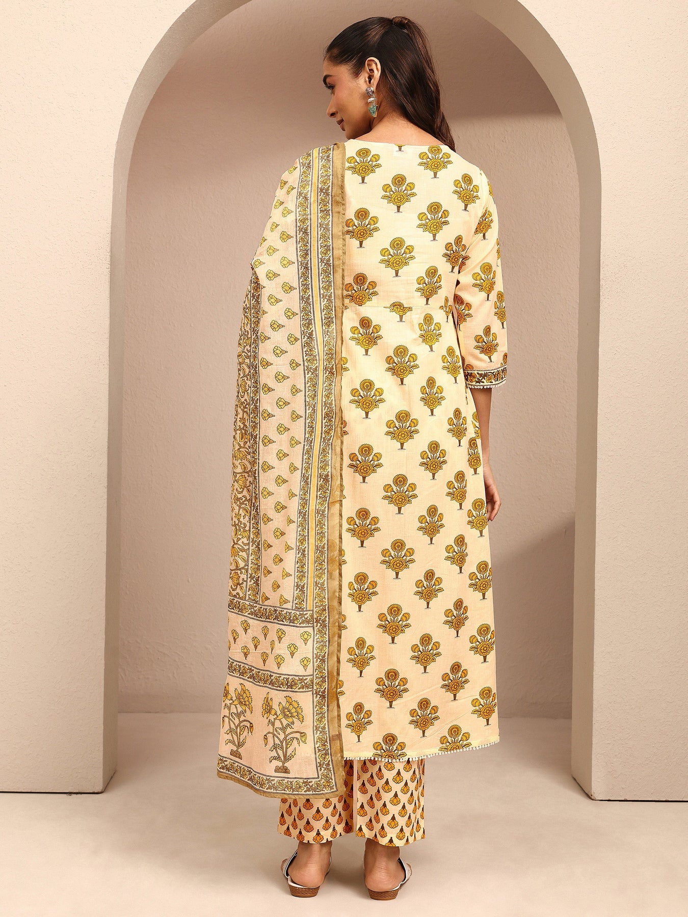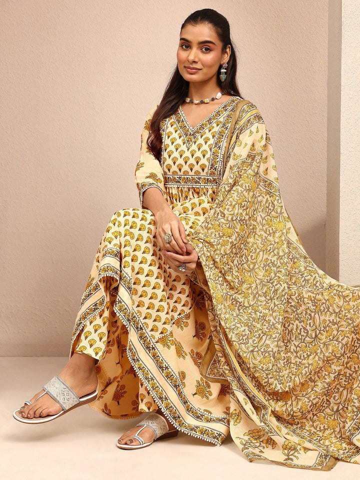 Yellow Printed Cotton Anarkali Suit Set With Dupatta
