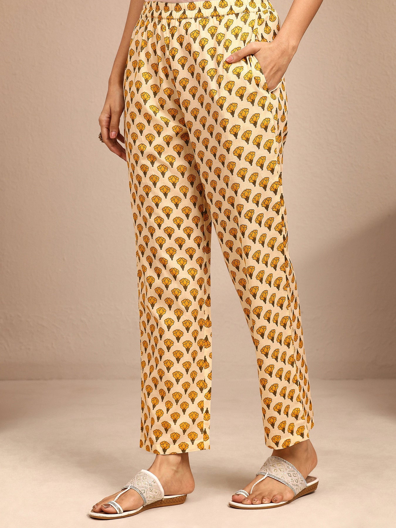 Our 3-piece beige cotton Anarkali kurta set features a V-neckline, regular sleeves, and statement yoke. Complemented with straight pants with a partially elasticated waistband and 2 pockets, and a floral dupatta. Adorned with floral printed, this style is perfect for festive occasions.