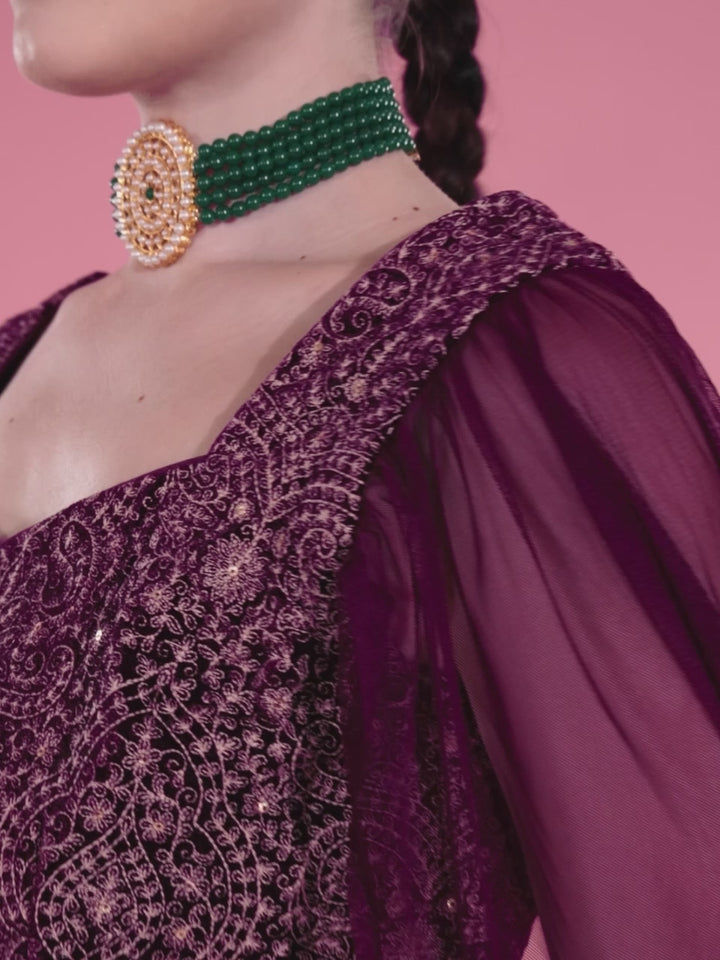 Our 2-piece burgundy velvet lehenga choli set features an embellished blouse with a sweetheart neckline and statement flowy sleeves. Complemented with a flared skirt with a side-zip closure. Adorned with intricate thread work, and sequins accents, this style is perfect for festive celebrations.