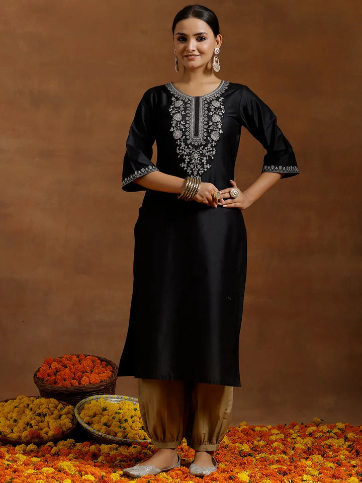 Our black embroidered silk blend straight kurta features a round neckline, three-quarter sleeves, and a statement yoke. Adorned with sequins and thread work, this style is perfect for festive celebrations.