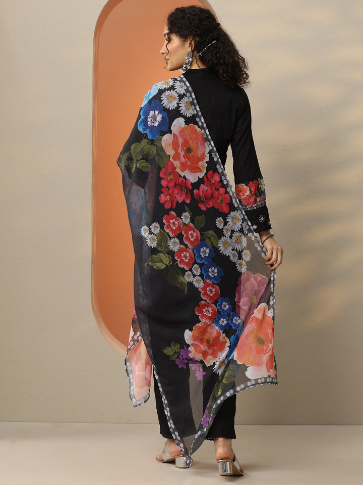 Black Embroidered Cotton Blend Straight Suit Set With Dupatta